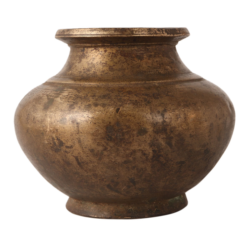 The vintage holy water pot is made of bronze. It is handmade by local Indian craftsmen. It has a faded brownish appearance. You can use it as a flower pot or stage decoration.