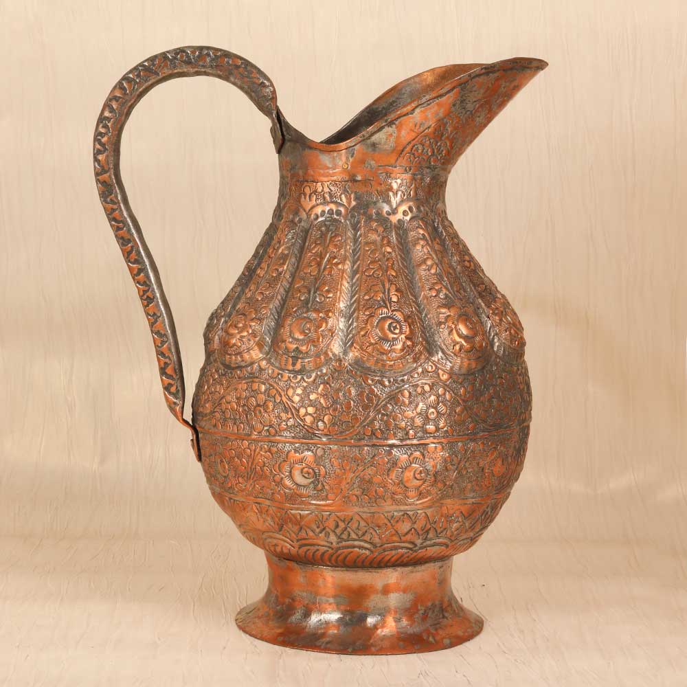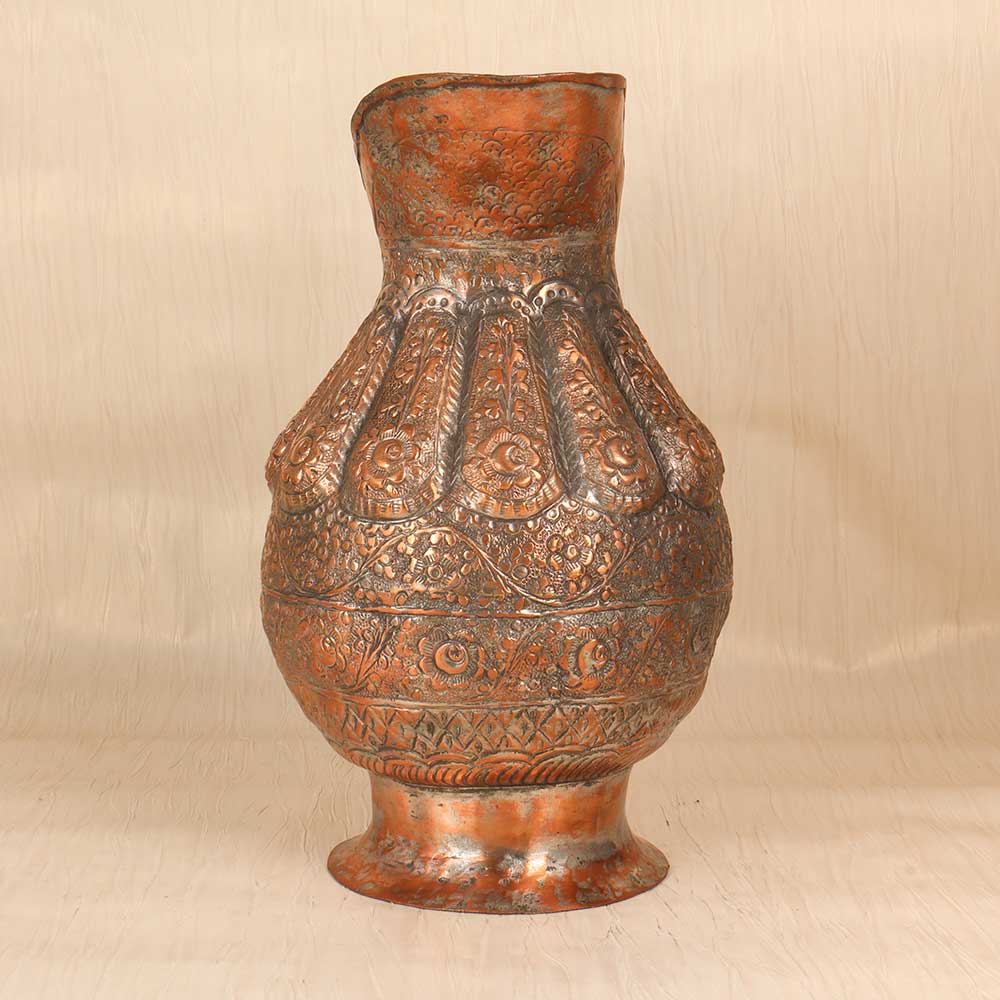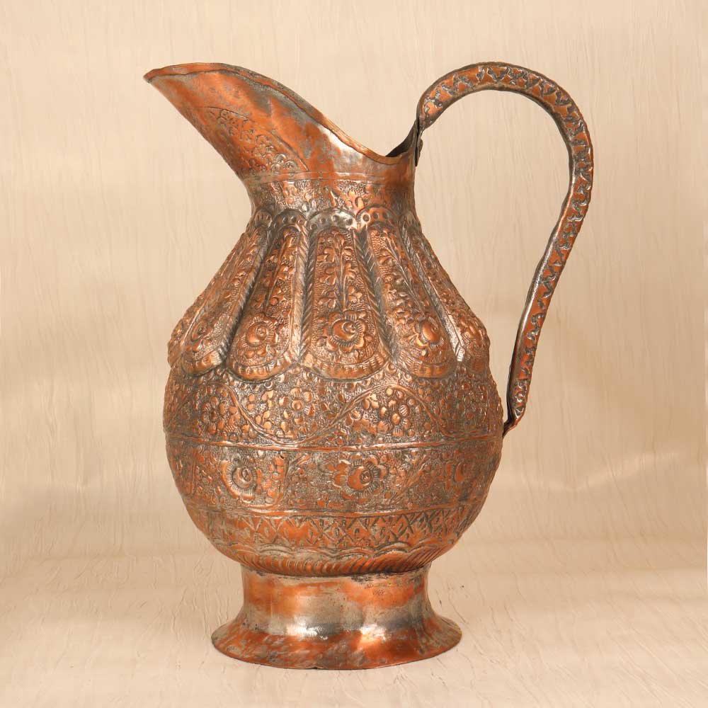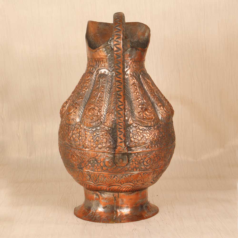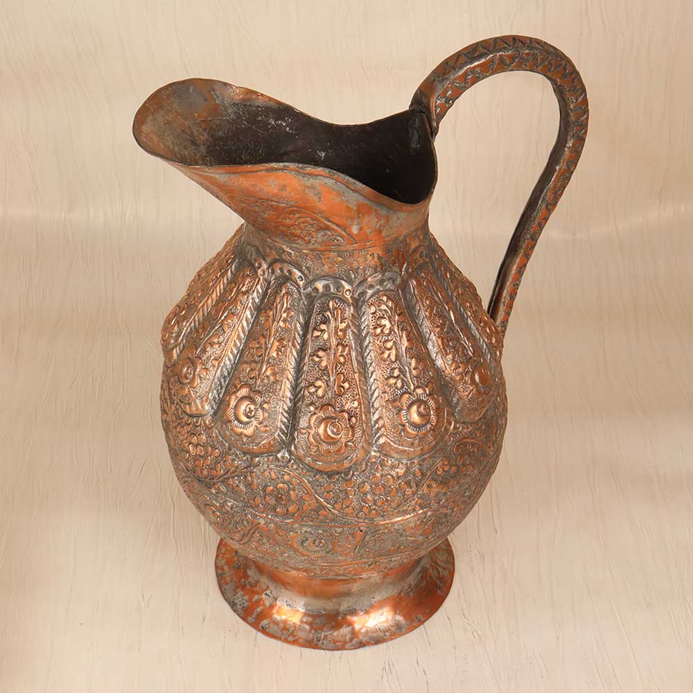 Revel in the exotic allure of ancient Islamic art with this ornate vintage copper jug. Hand engraved with intricate motifs and patterns, this jug evokes the romance of ancient Middle Eastern bazaars. This stunning jug features mesmerizing engraved floral designs, geometric shapes, and flowing Arabic script. Each pattern was meticulously carved by skilled artisans, bringing the motifs to life. The textured, weathered copper has an antique look that adds to the exotic allure. Whether displayed as an accent piece or used decoratively, this ornate copper jug transports you to ancient times. For collectors and designers, it's a meaningful find that tells a story through its engraving. Let this special jug draw you into a world of timeless beauty and intricate artistry. Make it the star of your home decor and revel in its vintage charm.