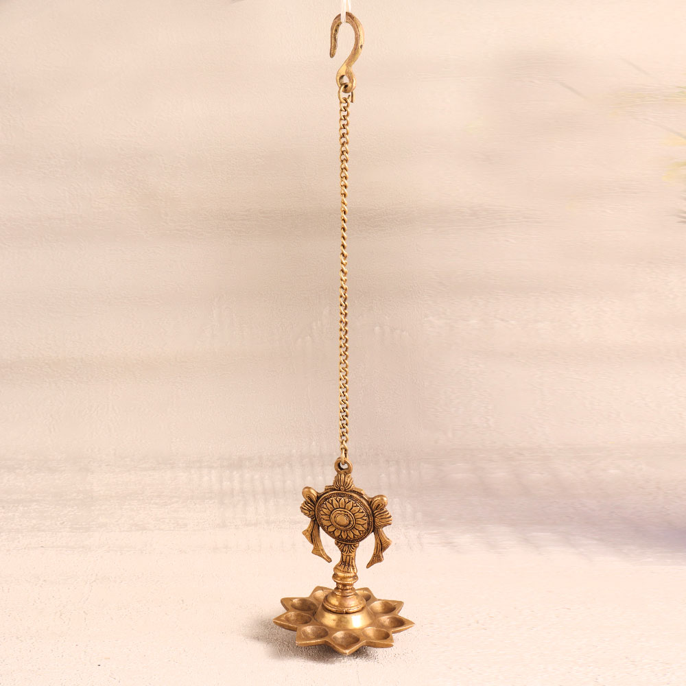 This vintage hanging brass oil lamp is adorned with the divine Lord Vishnu Chakra. Crafted by skilled Indian craftsmen, this masterpiece is a true testament to their craftsmanship and attention to detail. The lamp's antique golden finish exudes an aura of timeless elegance and charm. Featuring a chain for easy suspension, this brass lamp holds nine jyots (flames) that can be ignited with either mustard oil or ghee and cotton wicks, infusing your space with a warm, inviting glow. Its versatility makes it a splendid addition to your home, office, hotel, cafe, shop, or restaurant's prayer room, where it creates an atmosphere of serenity and spirituality. This lamp is more than a decorative piece, it's a cherished heirloom. Display it in your vintage collection or showcase it at exhibitions to share its beauty with others. During prayers or auspicious occasions, kindle the nine jyots to invite divine blessings into your space. Additionally, it makes for an ideal gift for your family, friends or relatives on special, festive, or auspicious occasions.