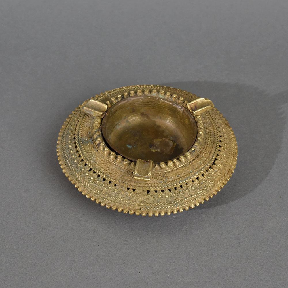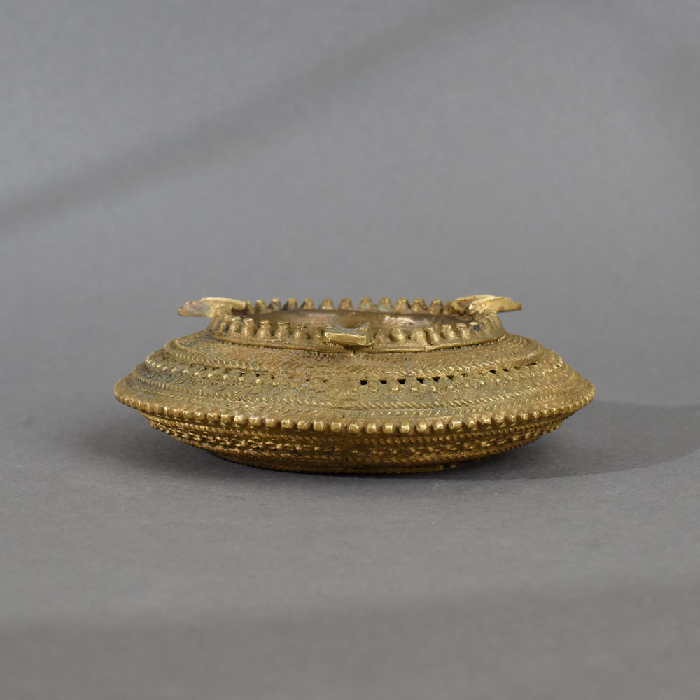 This vintage brass tribal ashtray is a stunning example of traditional Indian metalwork, capturing the essence of indigenous craftsmanship. The round, shallow bowl is framed by intricately embossed concentric rings featuring floral, beaded, and rope motifs, each etched by hand with impeccable precision. The ashtray’s surface bears the patina of age, enhancing its authentic and rustic appeal. Designed for function and beauty, this ashtray features three symmetrical rests for cigars or incense, perfectly blending utility with design. Whether used in a smoking lounge, sacred space, or as a conversation-starting décor piece, it adds cultural richness and artisanal charm to any setting. A rare collectible from tribal India, this ashtray is ideal for vintage collectors, antique dealers, and enthusiasts of ethnic art.