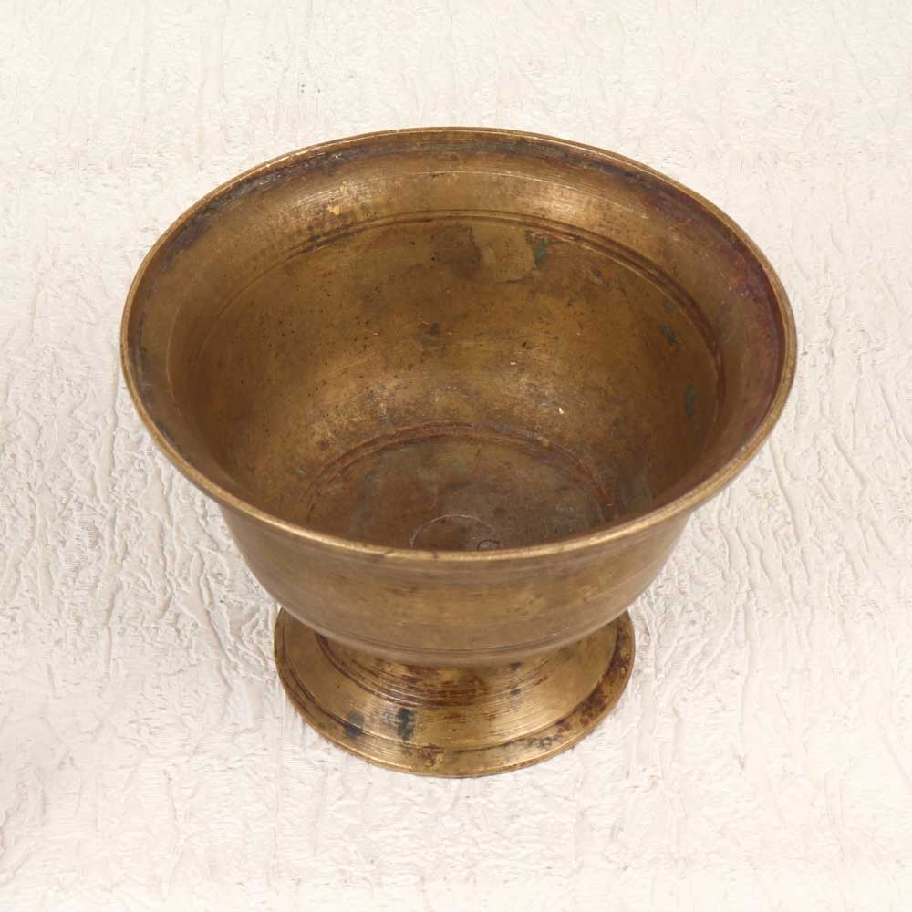 Crafted in solid brass with a vintage South Indian design, this kumkum cup becomes a focal point in your pooja space. Its slender curving shape draws the eye, while the intricately worked brass body reflects light beautifully. Applying kumkum or holy ash is easy with the cup's wide, stable base and smooth uniform finish. The feel of the cool brass in your hand connects you to the artistry put into this cup's creation. With its old-world styling, this handmade cup brings tradition and meaning to your rituals. Its craftsmanship carries on centuries-old South Indian artisan techniques rarely seen today. Place this vintage brass cup prominently in your home mandir to elevate your worship space. Let its elegance and handmade origins make your pooja practice more intentional and beautiful. This is a piece to cherish and pass down for generations.