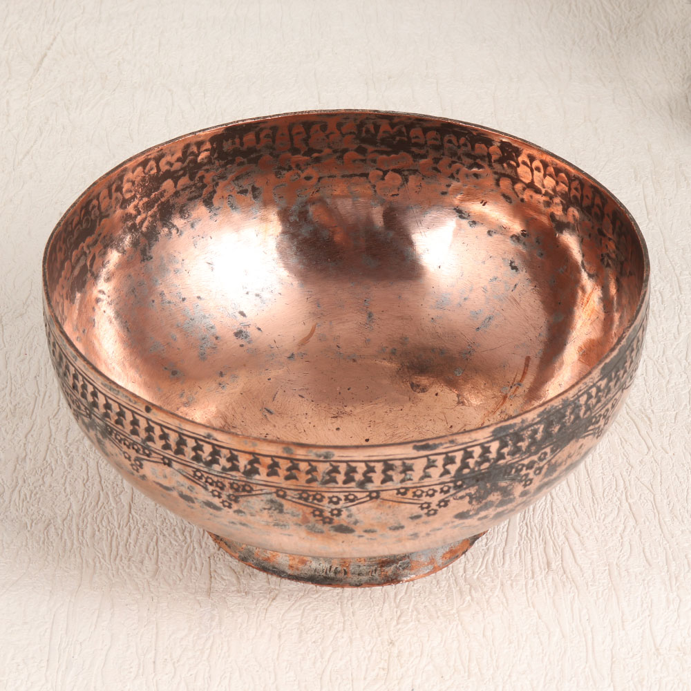 A Vintage Copper Food Bowl which is a testament to the timeless artistry of highly skilled Indian artisans. Crafted with precision in the captivating Islamic Art style, this remarkable piece is sure to be a conversation starter in any setting. Handcrafted from high-quality copper, the antique brown finish adds a sense of history and character to this unique piece. Its intricate engravings are a visual feast, showcasing the artisan's dedication to their craft. While this vintage copper food bowl harks back to a bygone era of culinary artistry, it is primarily intended for decorative purposes. Adorn your home, office, restaurant, hotel, cafe, or shop with this striking piece to add an air of vintage elegance. As a collector's dream, it's perfect for enhancing your vintage collection. Moreover, it makes for an extraordinary gift, ideal for surprising your family, friends or relatives on special, festive, or auspicious occasions.