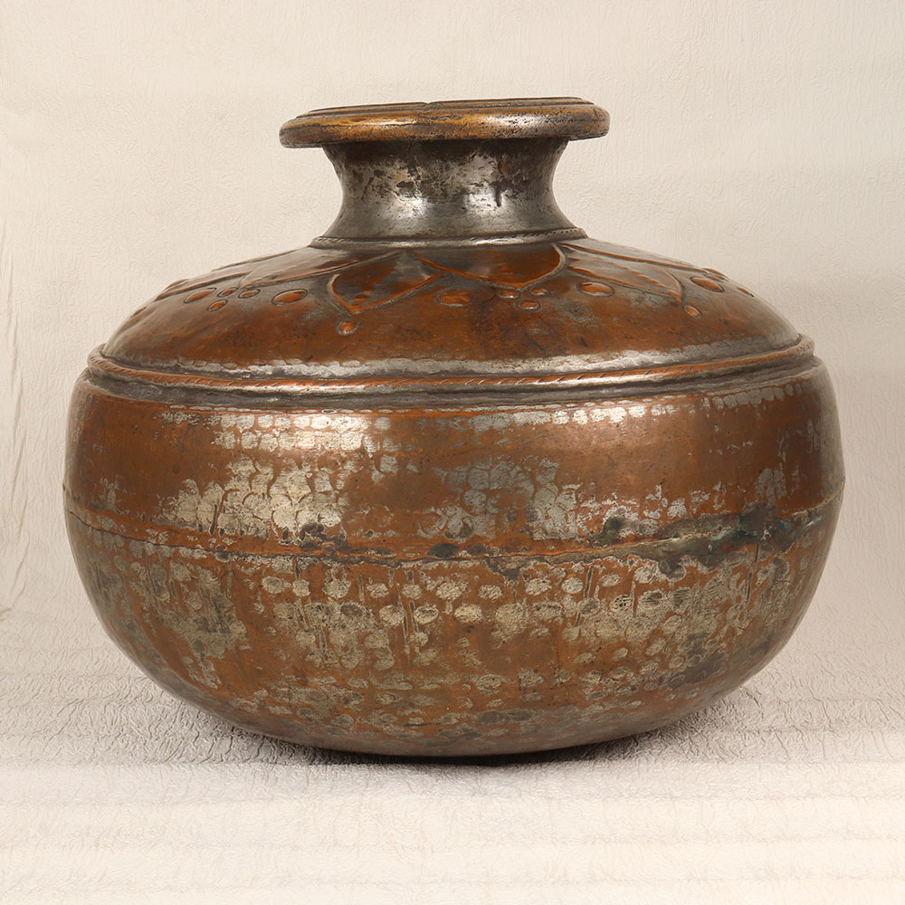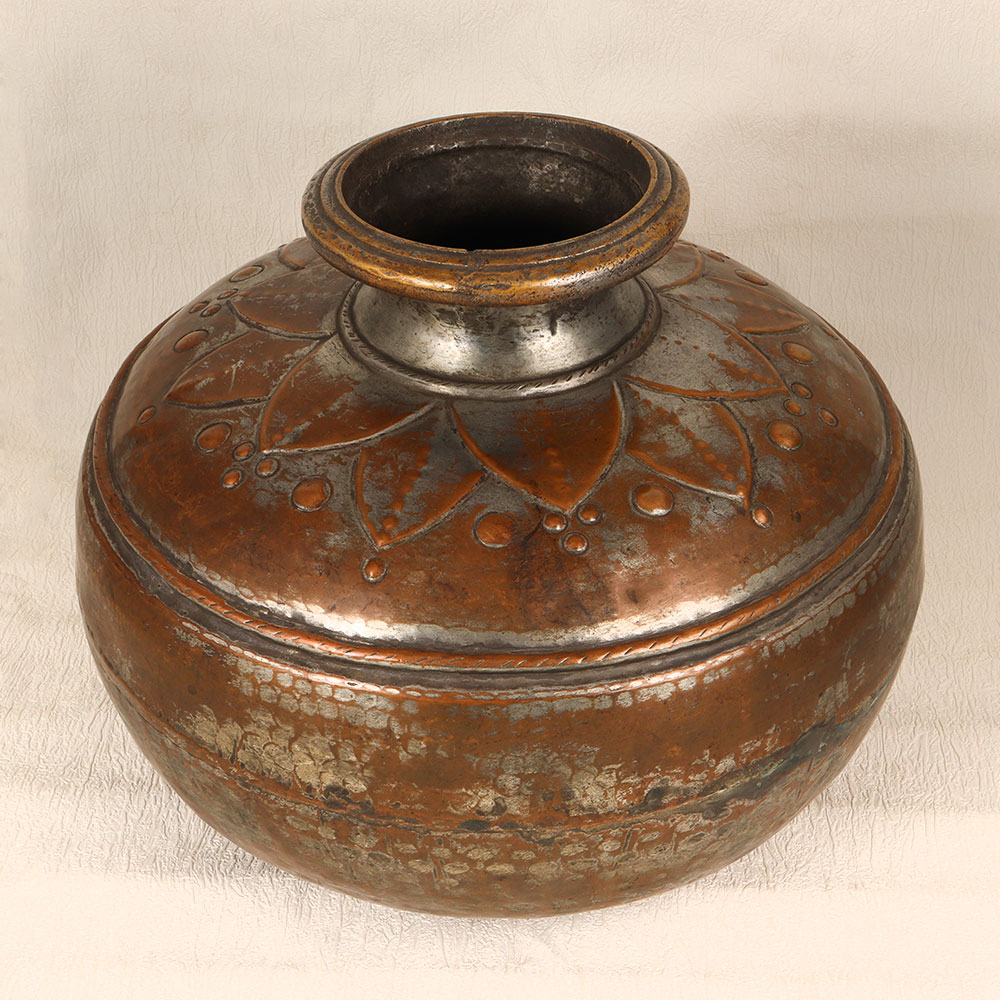 A Vintage Copper Water Pot that is a timeless piece of functional art crafted by highly skilled and experienced Indian artisans in the rich tradition of Islamic Art. Handcrafted with precision and care, this unique pot showcases the mastery of these artisans who have seamlessly blended tradition and craftsmanship to create a stunning piece. The pot features a small mouth adorned with intricate engravings that tell a story of cultural heritage and artistic finesse. Its antique brown finish adds a touch of nostalgia, reminiscent of a bygone era. Meticulously crafted from high-quality copper, this pot is not only a testament to the enduring beauty of Islamic Art but also a functional item that can be used as an indoor flower pot. Versatile and elegant, this Vintage Copper Water Pot can effortlessly grace any space, be it your home, office, restaurant, hotel, or cafe. Its presence adds a touch of vintage charm and sophistication, making it a perfect addition to any antique collection. Furthermore, this exquisite piece makes for an unforgettable gift on special, festive, or auspicious occasions, allowing you to share the beauty of traditional craftsmanship with your family, friends or relatives.