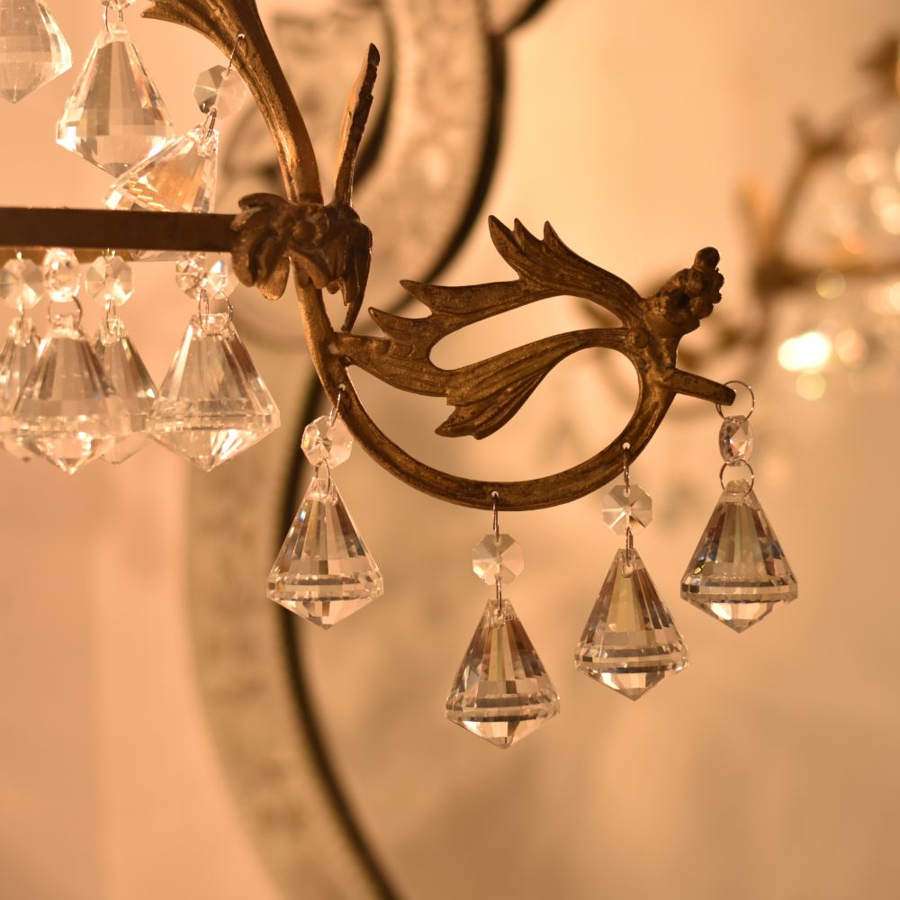 This beautiful Italian-style enameled Chandelier is the perfect addition to any room. The gilded ceiling light is accented with crystal drops and a chandelier base. Vintage brass fixtures look great in a classic setting or modern style home. The Italian-style enameled Chandelier features a beautifully gilded vintage brass ceiling fitting, with elegant crystal drops that are sure to add a touch of elegance and luxury to any room. This stunning chandelier is sure to impress any guest or have the perfect mood lighting for your space. This crystal chandelier is hand-crafted with artisanal techniques. The colors are gilded and the crystals are set in a fern pattern to create an elegant look. Beautiful multi-faceted crystals, clear and sparkling make this chandelier a statement maker. This magnificent light fixture provides an elegant and timeless look for your space.
