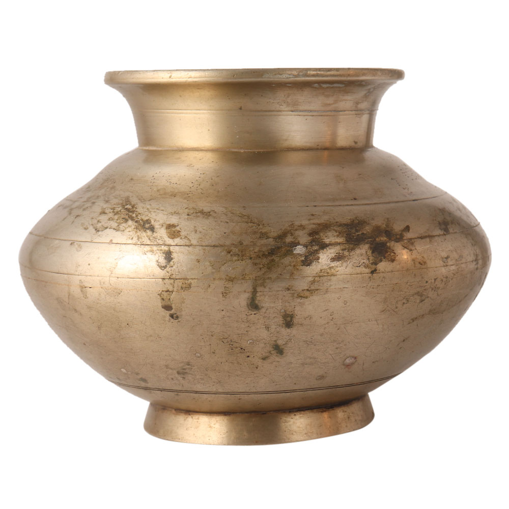 A kalash is a vessel with a small mouth at the top and a low belly. It is used in Hindu rites and contains coins, grains, or water with a coconut on top covering the mouth. This water pot is made of white bell metal and is a perfect collectible.
