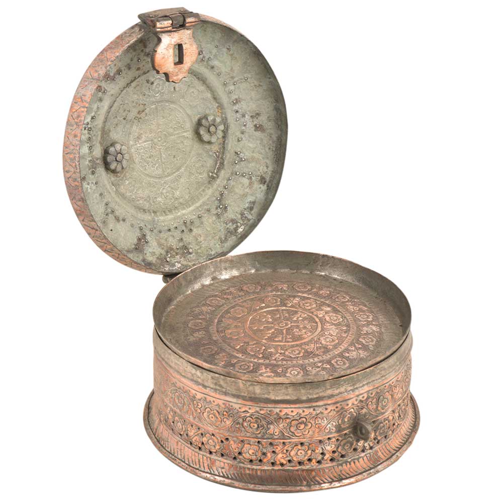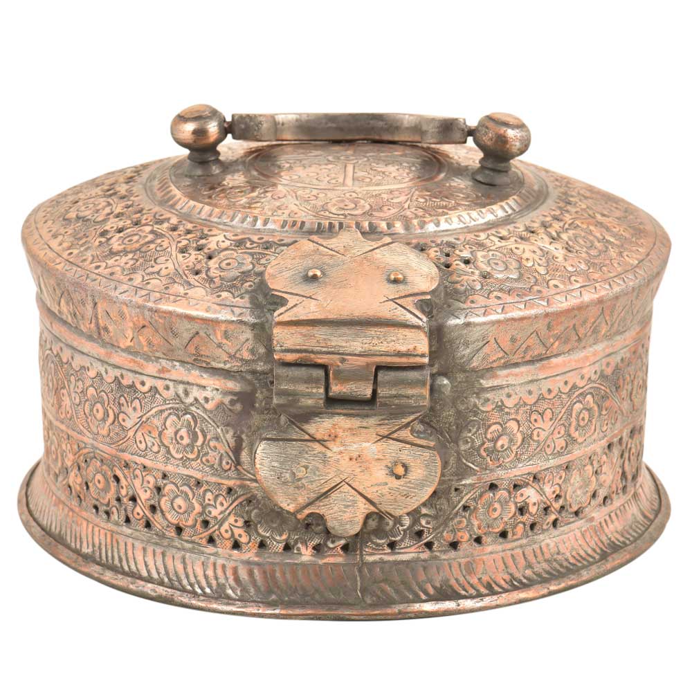 Hand Embossed Copper Betel Nut Pandan Box – with hand hammered floral and incised decoration used to store betel leaf, lime, tobacco and the nut from the areca palm. The practice of chewing betel nut was popular all over Asia and is still a common practice in Myanmar and India. This Pandan betel nut box contains six small pots, each incised on the tops and sides with the same design and metal.