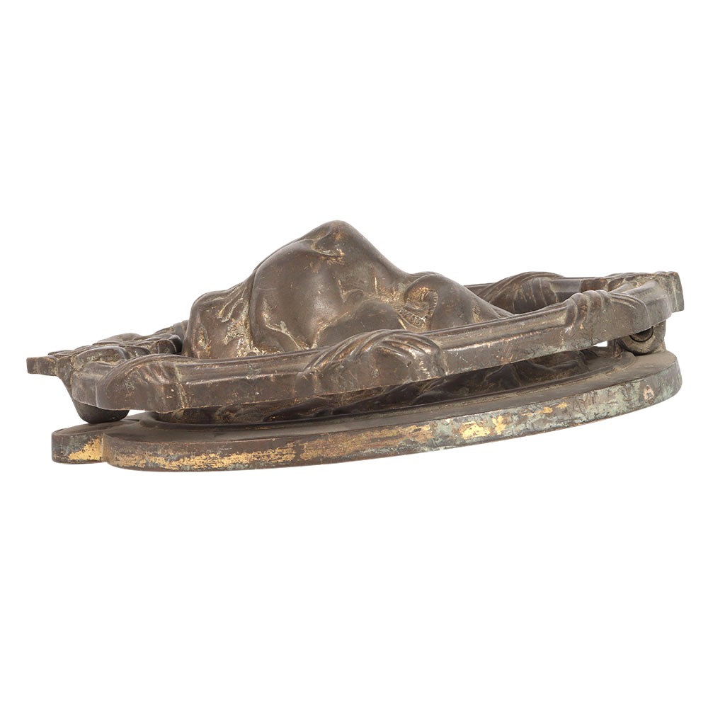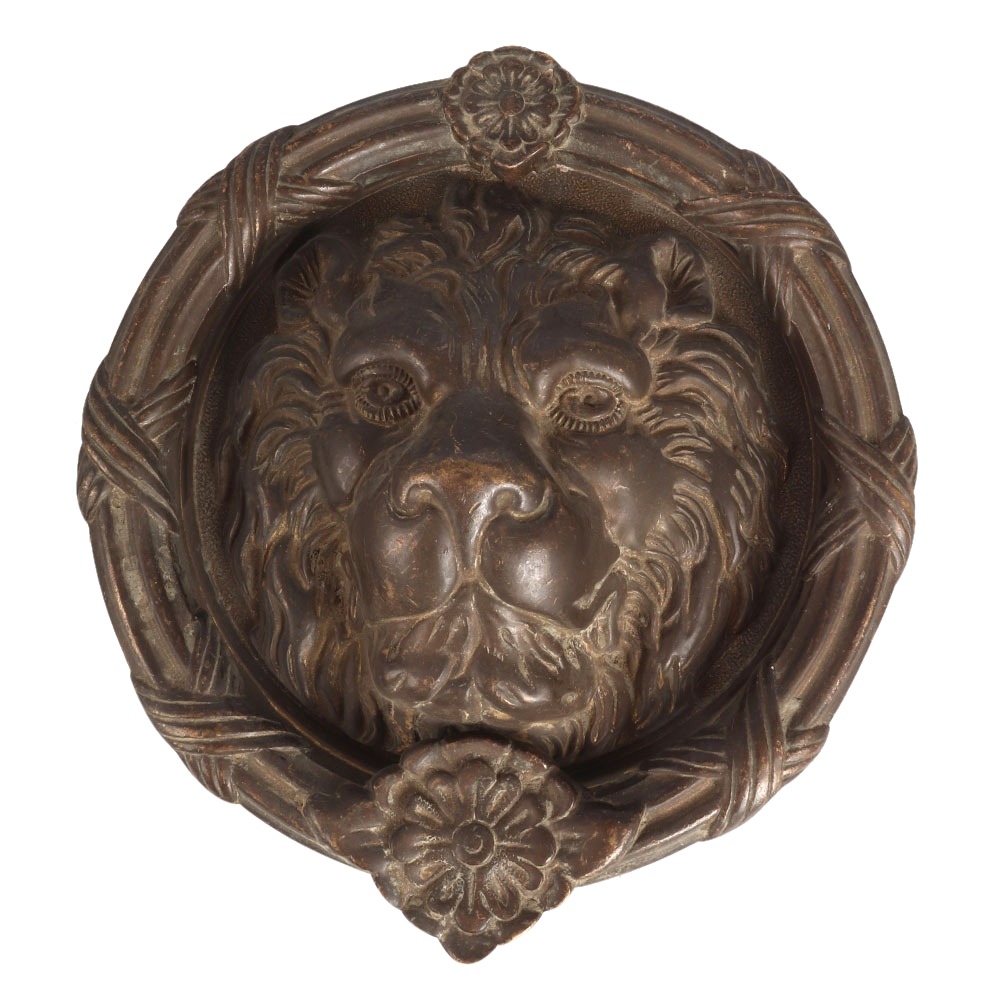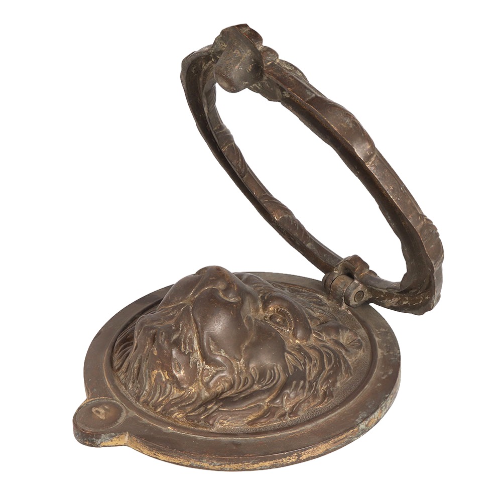 A vintage lion door knocker made of brass in the English art. It is heavy and has a dark brownish colour with an antique finish. It has a large surface that clangs against the metal. Hang it on the main door of your home or clinic and welcome your guests in vintage style. It is a perfect piece of art for your vintage collection. Knockers with lion's head were used in houses of England in ancient times. They symbolise strength and power.