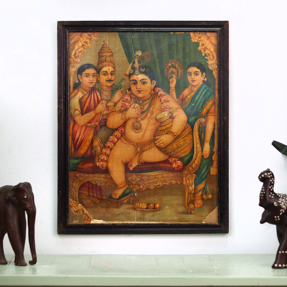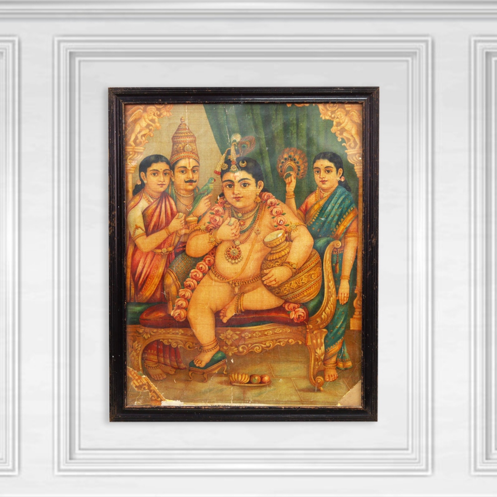 Elevate your living space with the captivating vintage beauty of this paper print showcasing the revered Lord Krishna as a child, surrounded by his loving parents. Expertly framed in a stunning wooden enclosure, this sacred artwork will infuse your home with a sense of timeless spirituality and cultural wonder. Experience the serene, timeless allure of this revered depiction of the young Krishna, a central figure in the Hindu faith. Display this artwork as a reminder to slow down, find inner peace, and immerse yourself in the profound spiritual traditions that have endured for centuries. Whether you're decorating a meditation space, a living room, or any area of your home, this vintage Krishna print will elevate your surroundings with its captivating beauty and transcendent charm.