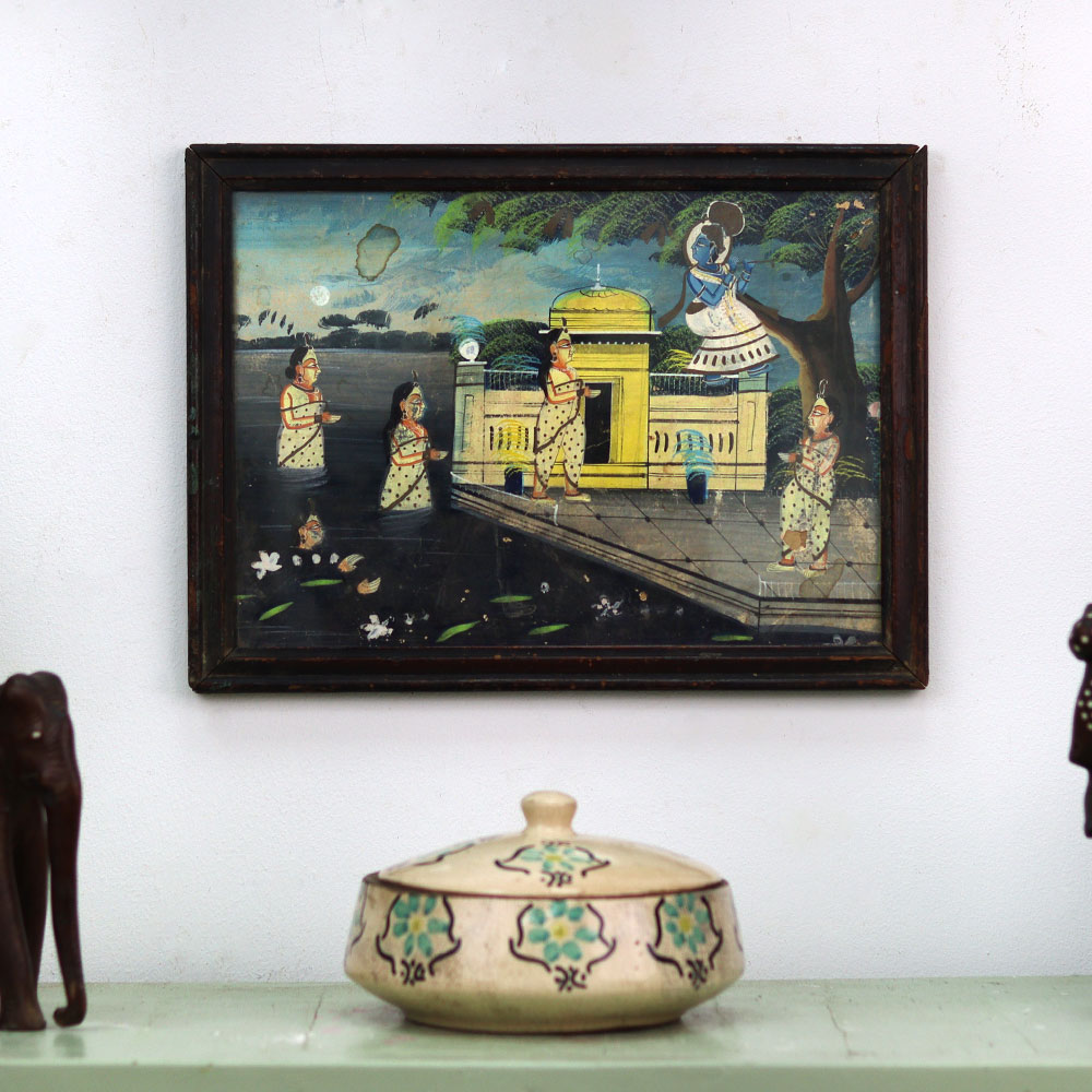 Immerse yourself in the captivating devotion of Lord Krishna's Gopis with this exceptional vintage painting. Masterfully crafted, the painting showcases the divine Krishna sitting atop a lush tree, surrounded by a gathering of adoring cowherd maidens who have come to worship him. The attention to detail is truly remarkable, with each element of the painting executed with the utmost care and precision. From the ornate clothing and jewelry adorning Krishna, to the delicate expressions and postures of the Gopis, every brushstroke has been lovingly applied to create a truly mesmerizing work of art. The vibrant colors and intricate patterns come together to create a sense of timelessness, making this painting a true treasure for any art enthusiast or devotee of Krishna. Displayed in your home, this vintage painting will serve as a constant reminder of the power of devotion and the divine. It is a piece that will captivate and inspire, transporting you to a realm of spiritual serenity and timeless beauty. Elevate your living space and enrich your life with this exceptional work of art, a testament to the enduring legacy of Lord Krishna and his devoted followers.