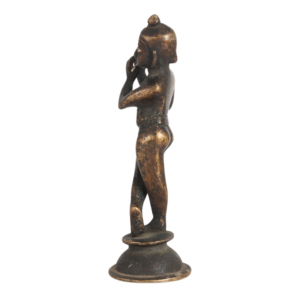 This statue of Lord Krishna is hand carved from brass in antique finish. Lord Krishna is Hindu god and is worshipped as the supreme god. In this statue, Lord Krishna is seen playing the flute and standing on his left foot while the other foot is crossed touching the ground. It is considered auspicious to place the statue of Lord Krishna in the northeast corner and facing east to west or west to east. Hindus prefer to gift Lord Krishna idol to their loved ones on various occasions like Janmashtami (birthday of Lord Krishna), Deepavali, wedding or baby shower.