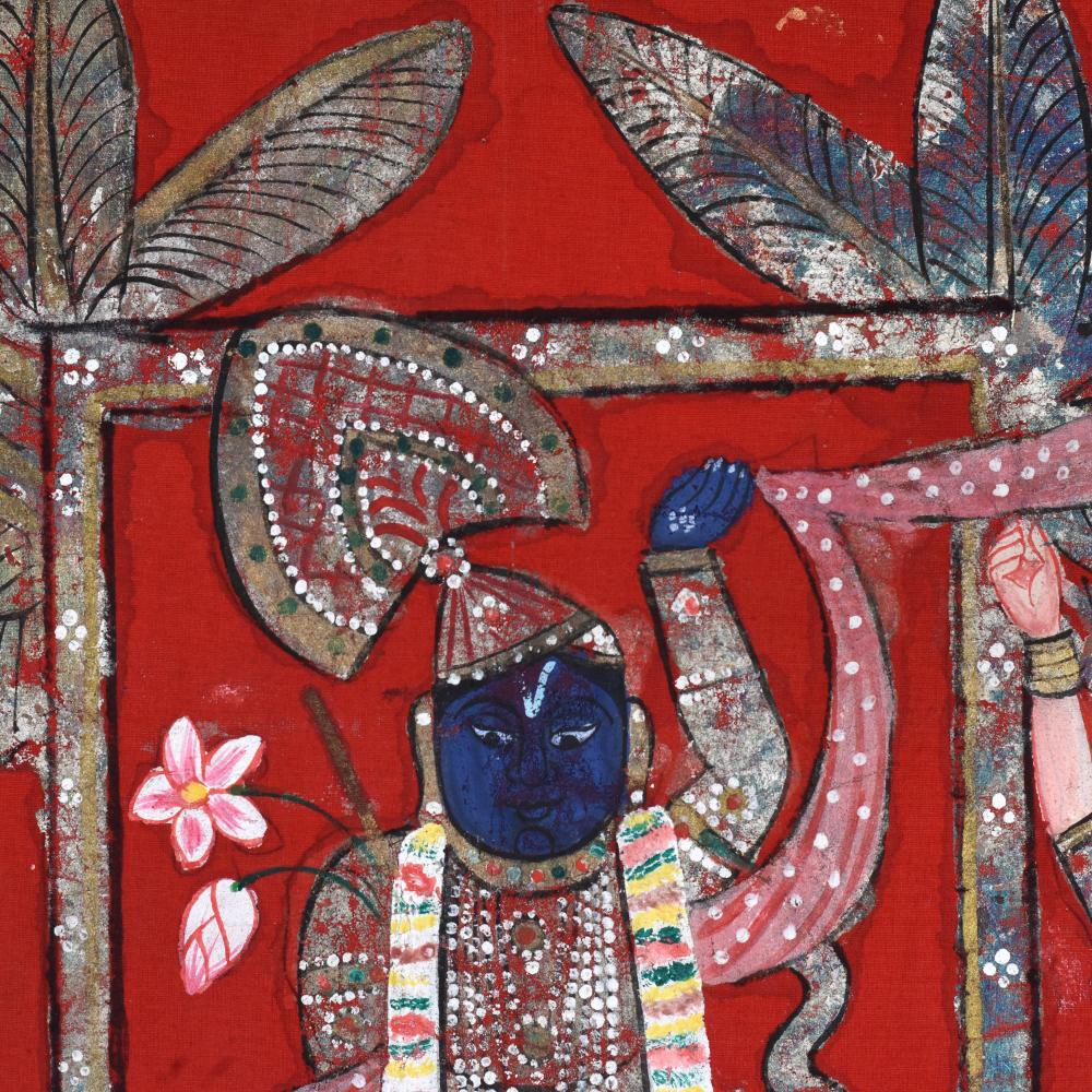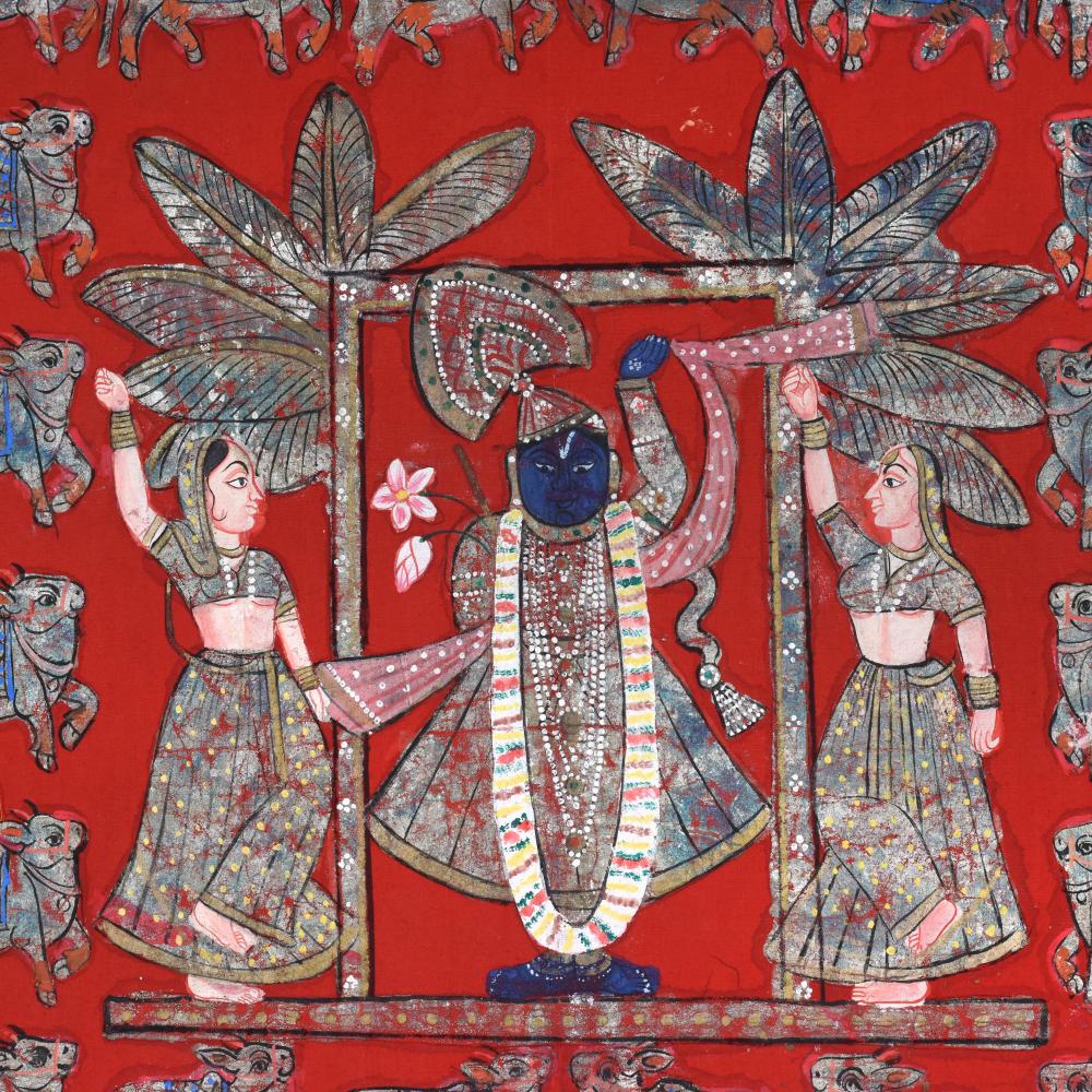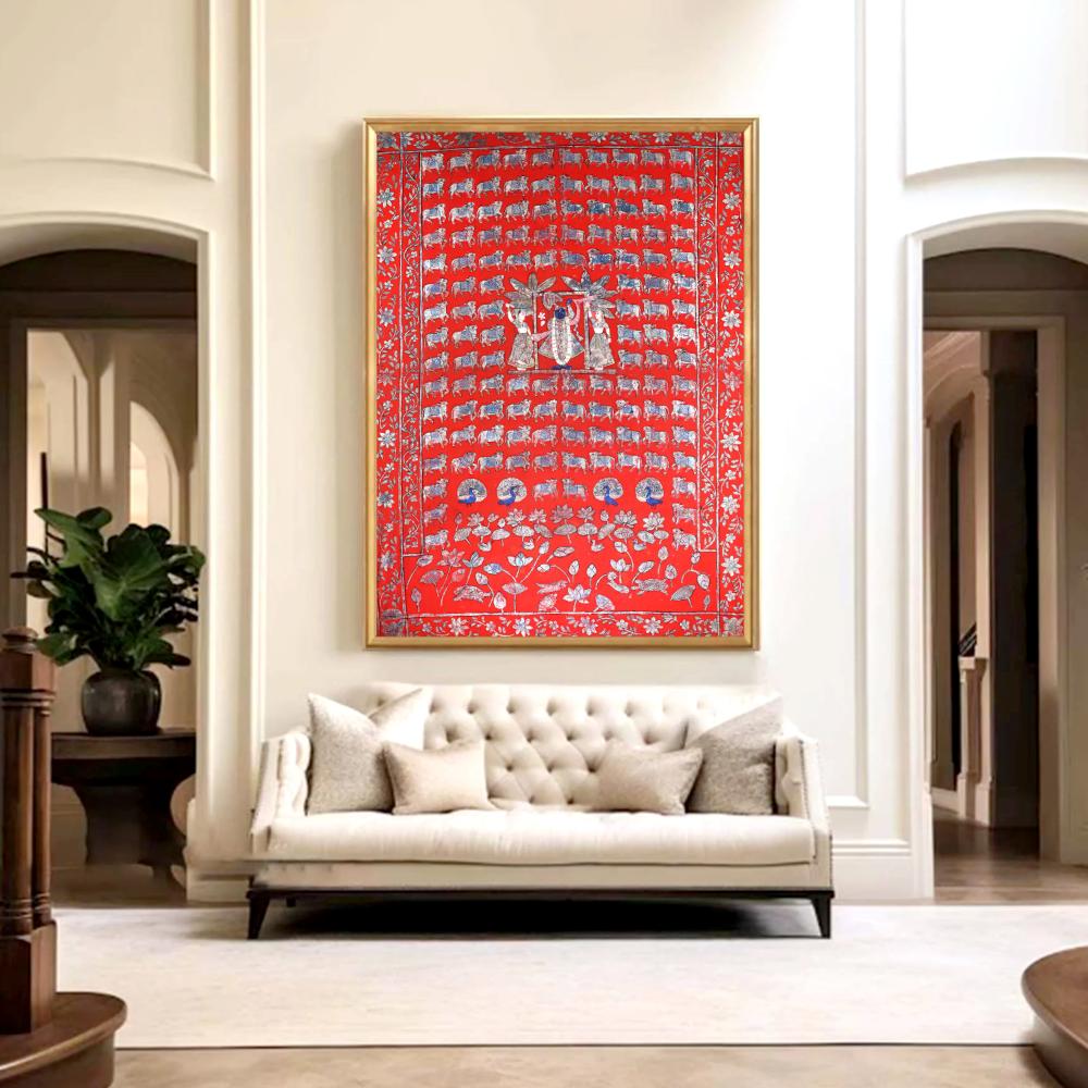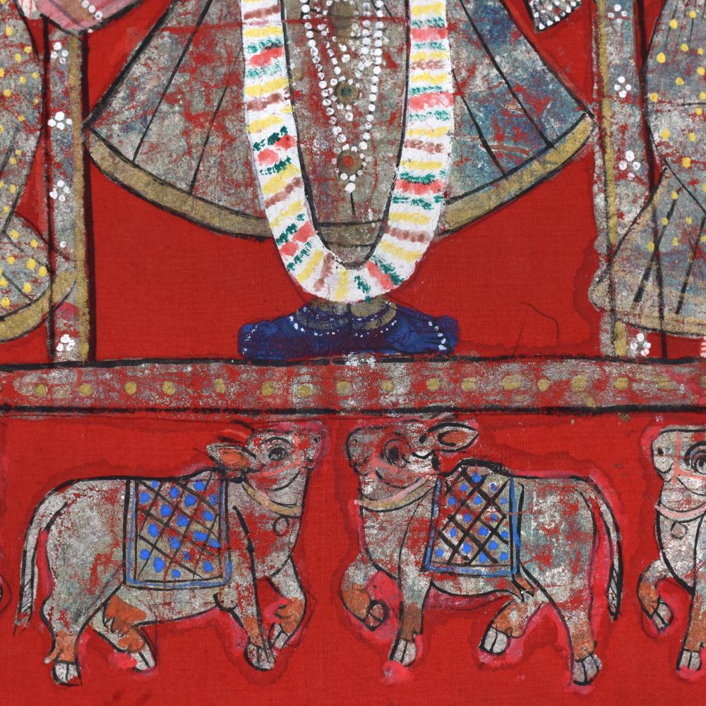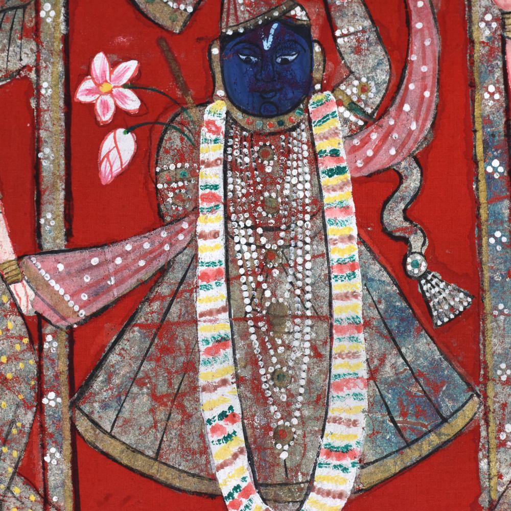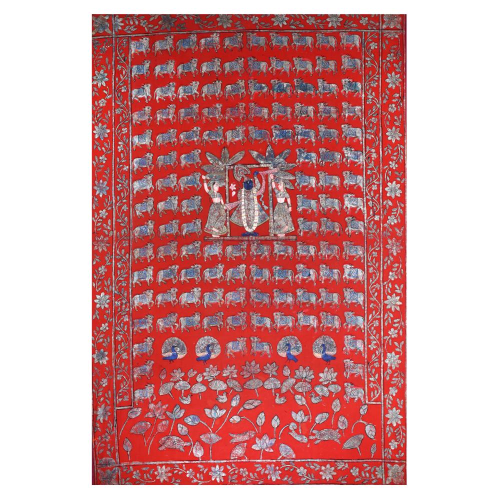 Immerse yourself in the divine beauty of Lord Krishna as he stands amidst his beloved gopis, radiating an aura of grace and serenity without frame. This exquisite cloth pichwai painting is a masterful blend of traditional Indian artistry and timeless spiritual symbolism. This pichwai painting is not just a work of art - it's a portal to the divine realm of Lord Krishna. Display it in your home or meditation space to cultivate a deeper connection with the divine and find solace in the timeless wisdom embodied within. Whether you're a devotee or simply appreciative of fine Indian craftsmanship, this painting will captivate and inspire you, transforming your living space into a sanctuary of spiritual tranquility. Elevate your spiritual journey and immerse yourself in the enchanting world of Lord Krishna with this stunning cloth pichwai painting. Invest in a piece that will not only beautify your home but also nourish your soul.