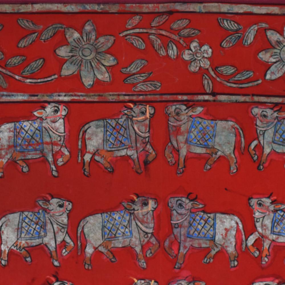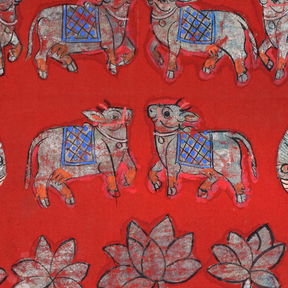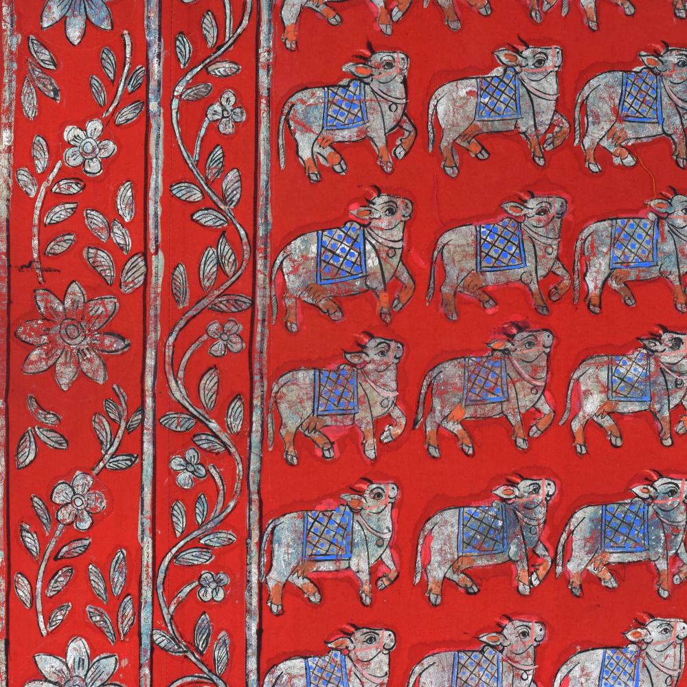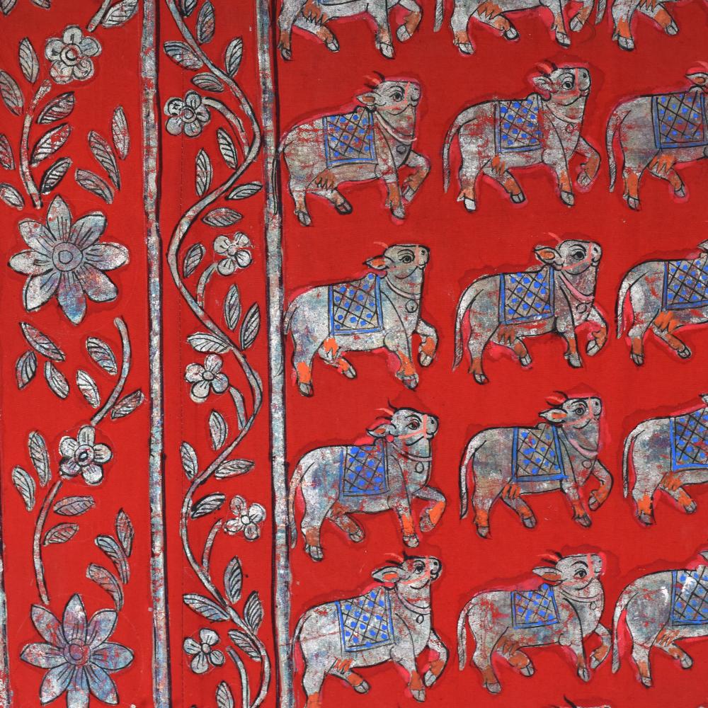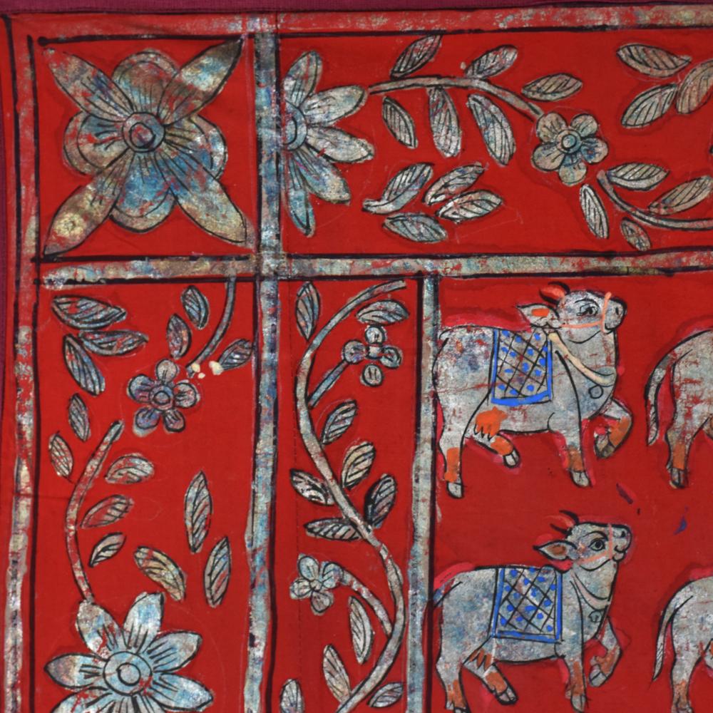- Vibrant red background accentuates the painting's energy, while the captivating cow pattern and floral border add depth and elegance