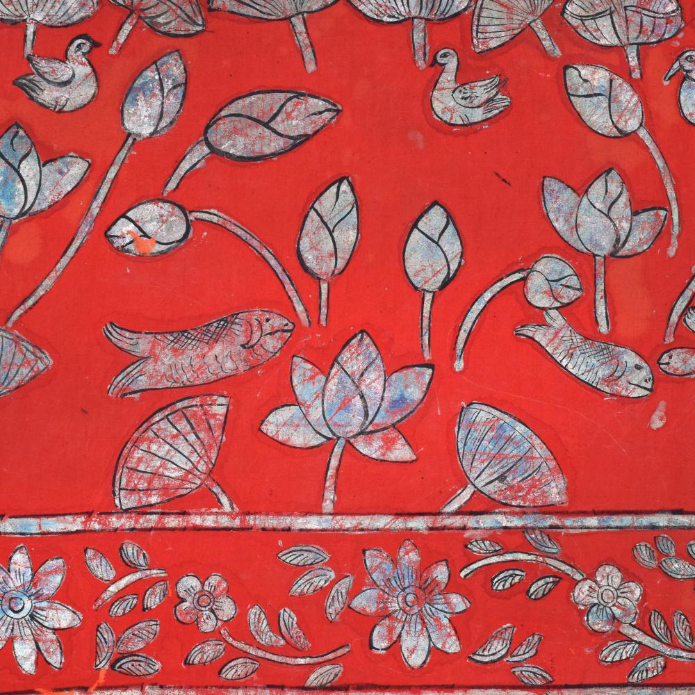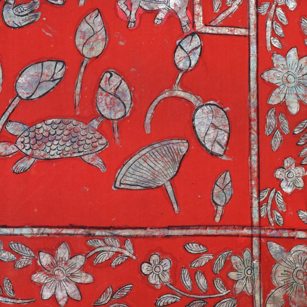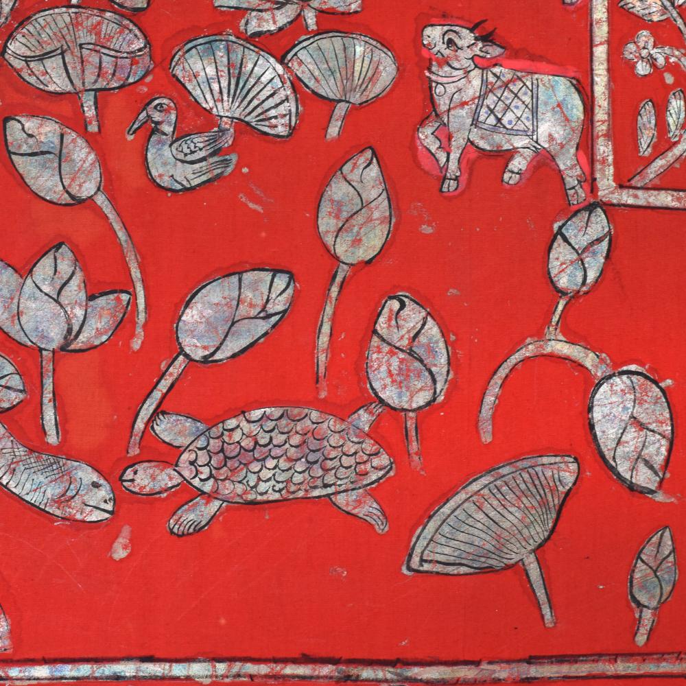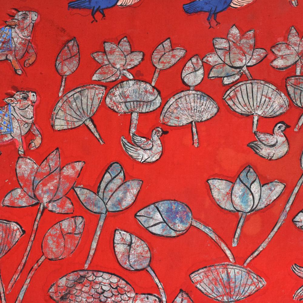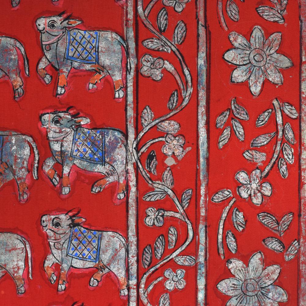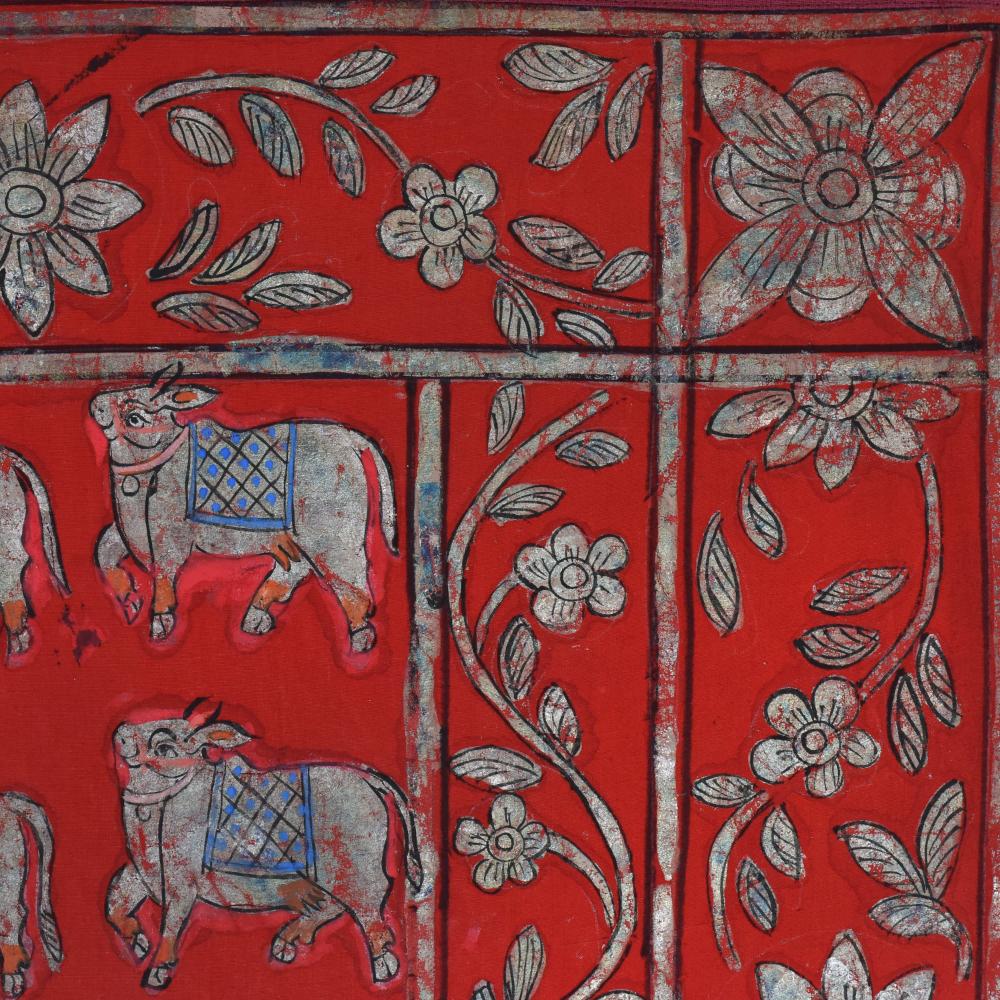 - Vibrant red background accentuates the painting's energy, while the captivating cow pattern and floral border add depth and elegance