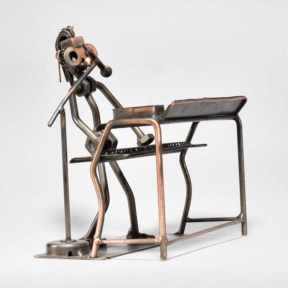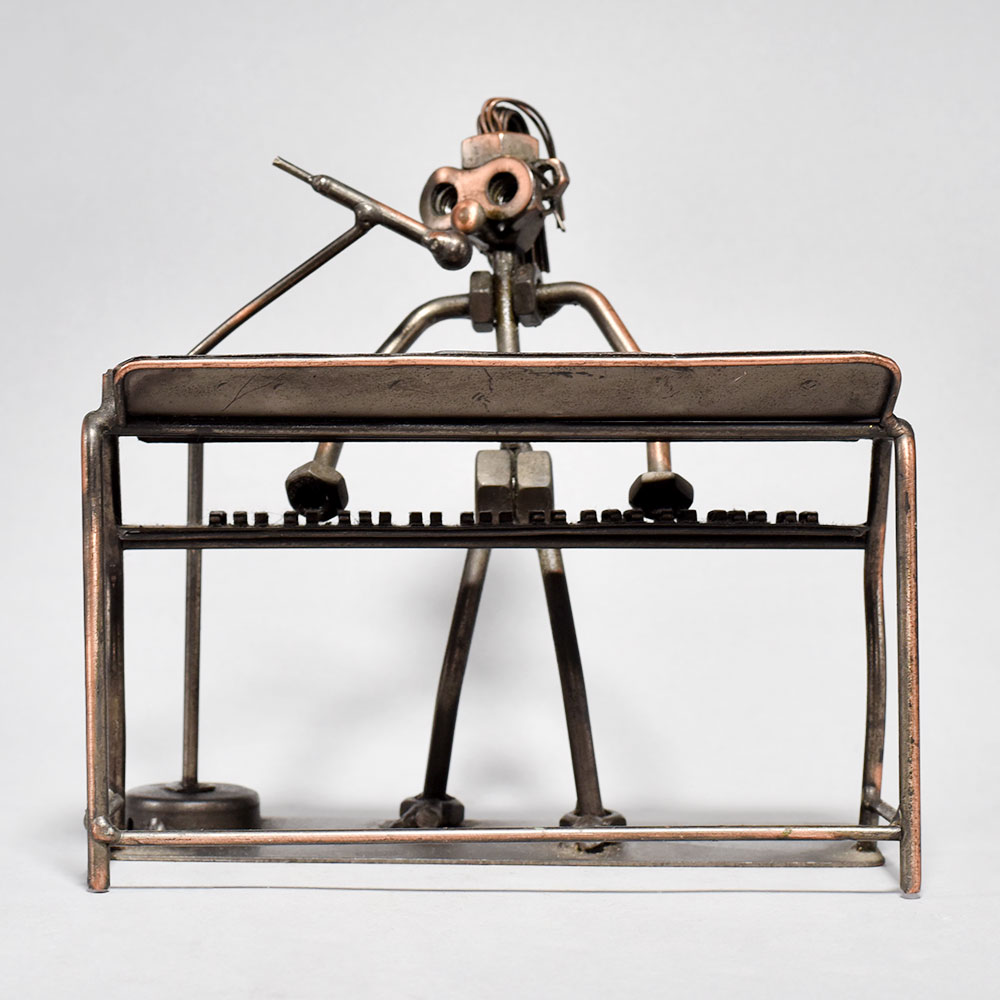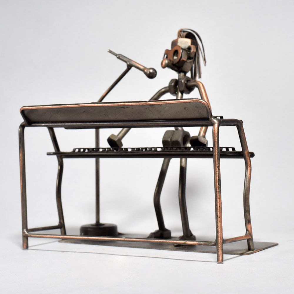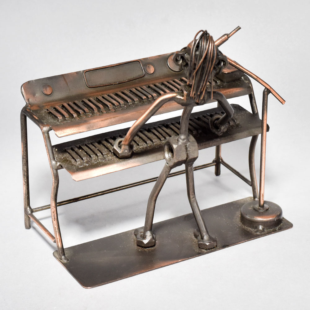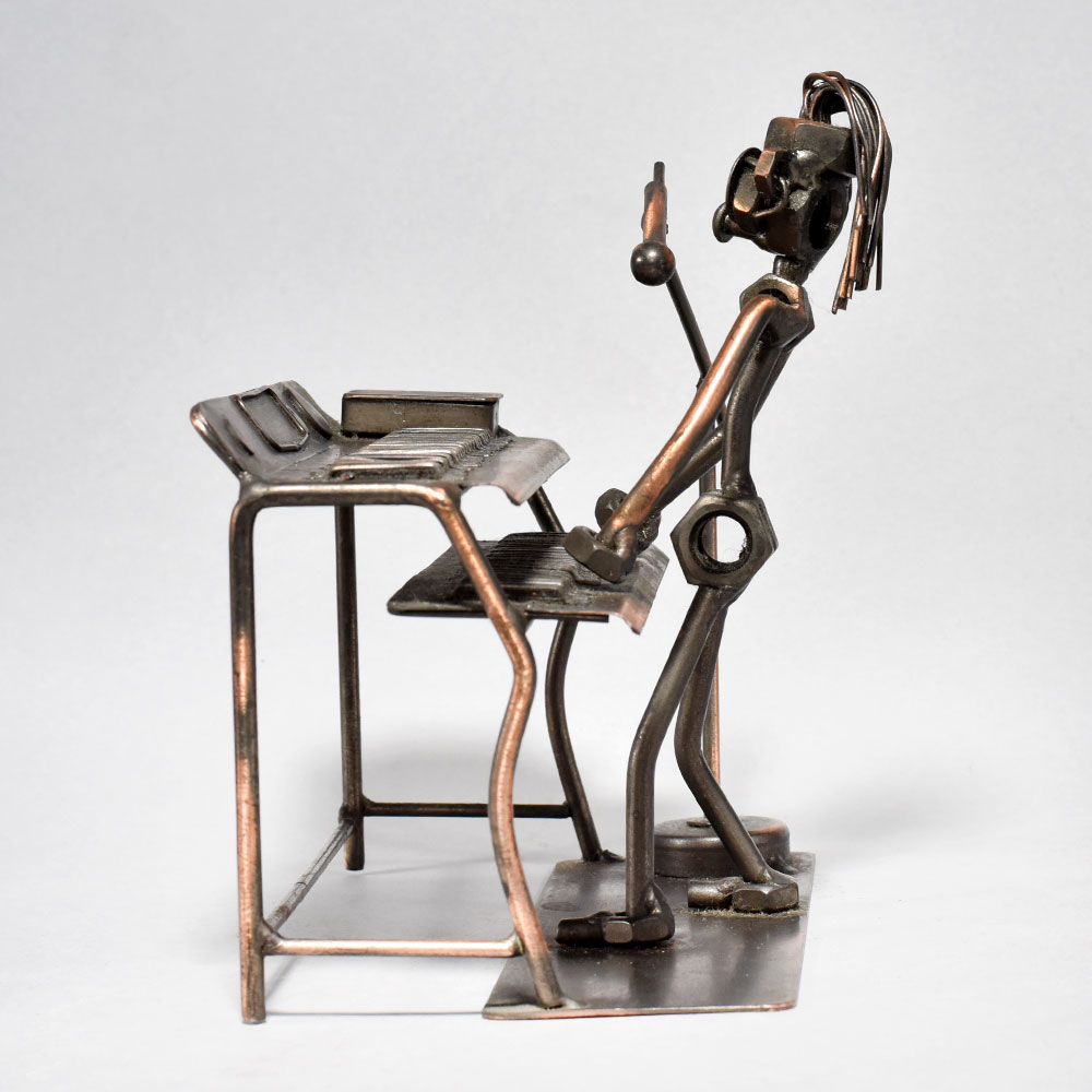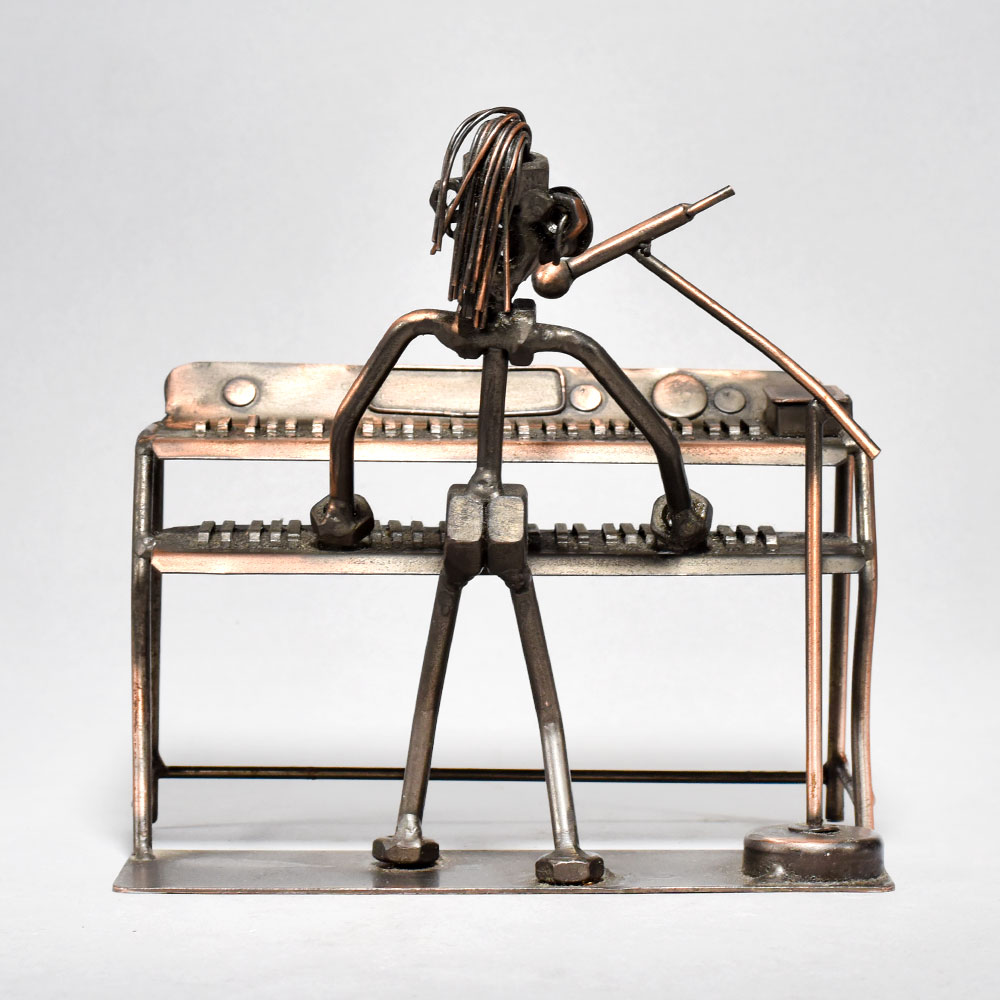 Elevate your decor with the vintage charm of this modern metal sculpture.This one-of-a-kind metal sculpture is a testament to the enduring power of artistic expression. The figure, enraptured in the act of playing the piano, exudes a palpable energy that will captivate all who behold it. Display this stunning piece in your home or office to infuse your space with the vintage charm and creative spirit of a bygone era. Captures the essence of a musician lost in passionate piano performance Crafted with meticulous attention to detail in durable iron Blends vintage inspiration with a sleek, contemporary aesthetic Adds an eye-catching focal point to any room This unique handcrafted piece is a testament to traditional artistry, blending functionality with beauty and making it a treasured collectible for years to come. This unique handcrafted piece is a testament to traditional artistry, blending functionality with beauty and making it a treasured collectible for years to come.
