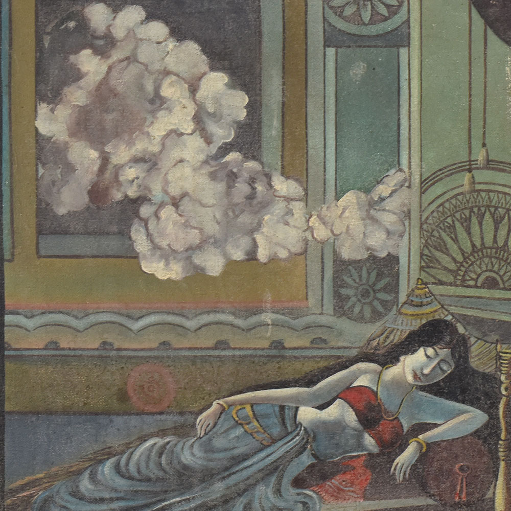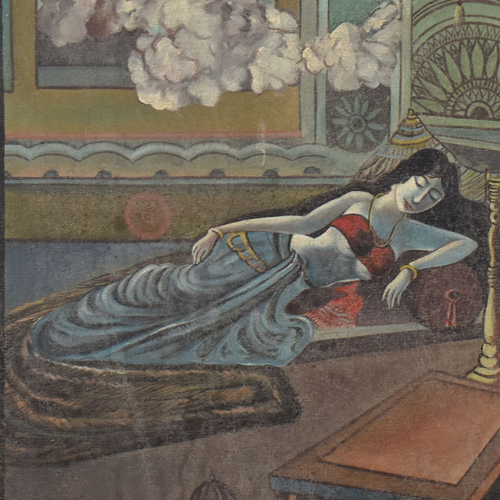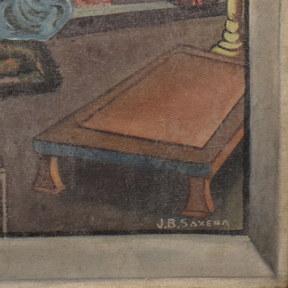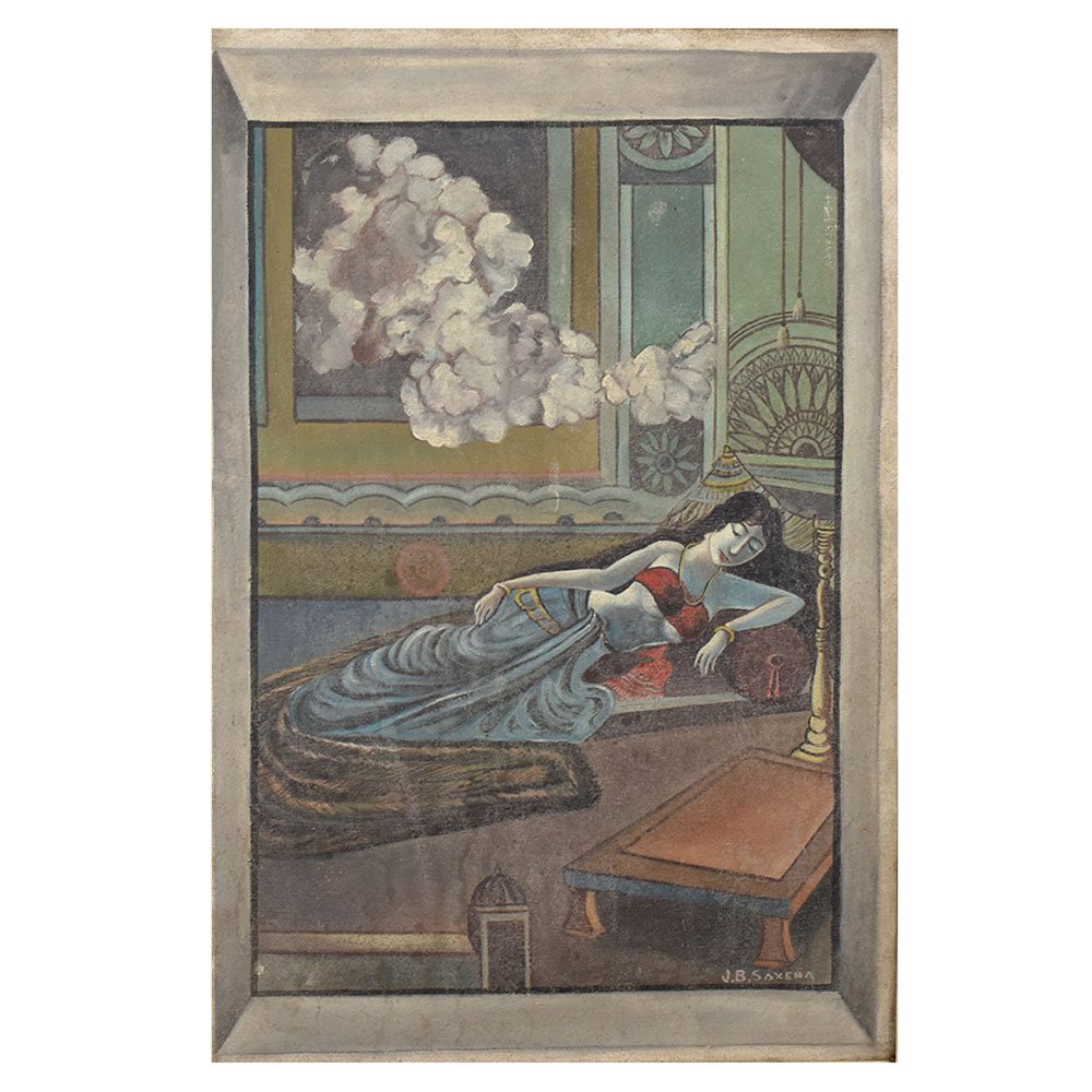 This vintage oil painting on hardboard, signed by the artist J.B. Saxena, beautifully captures a serene and intimate indoor scene steeped in old-world charm. The composition features a reclining woman dressed in a flowing blue skirt and a deep red blouse, her posture exuding relaxation and grace. She rests on a charpoy (traditional woven bed) adorned with a patterned cover, while the background reveals an ornate architectural interior with intricate wall motifs and hanging decor elements. The muted yet rich color palette of teal, ochre, and earthy browns lends the painting a timeless appeal, while soft brushstrokes create a gentle texture that enhances the atmospheric mood. Billowing clouds painted through an open window or mural-like frame introduce a dreamy, almost surreal element to the scene, blurring the lines between reality and imagination. With its blend of figurative art, architectural detailing, and subtle narrative undertones, this work is a fine example of mid-20th century Indian painting on hardboard. It would be a valuable addition to any vintage art collection, home gallery, or interior space seeking a touch of cultural elegance and historic artistry.
