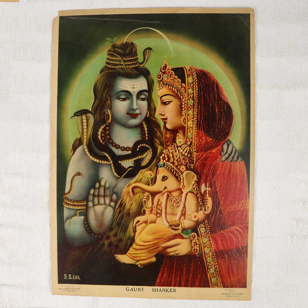 Experience the divine presence of Lord Shiva and Goddess Parvati with this exquisite vintage oleograph depiction of the Hindu holy family including baby Ganesha. Crafted by renowned Bengali artist S.S. Lal, this antique paper print immerses you in the peaceful aura of the deities through masterful artistry. For Hindu devotees seeking meaningful home decor, this print makes an heirloom-worthy addition. Place it in your puja room or meditation space to focus your daily spiritual rituals. Or proudly display it in your living room to appreciate the ageless beauty of Bengal's artistic lineage. However, you choose to showcase it, this antique oleograph print will infuse your home with divine blessing.