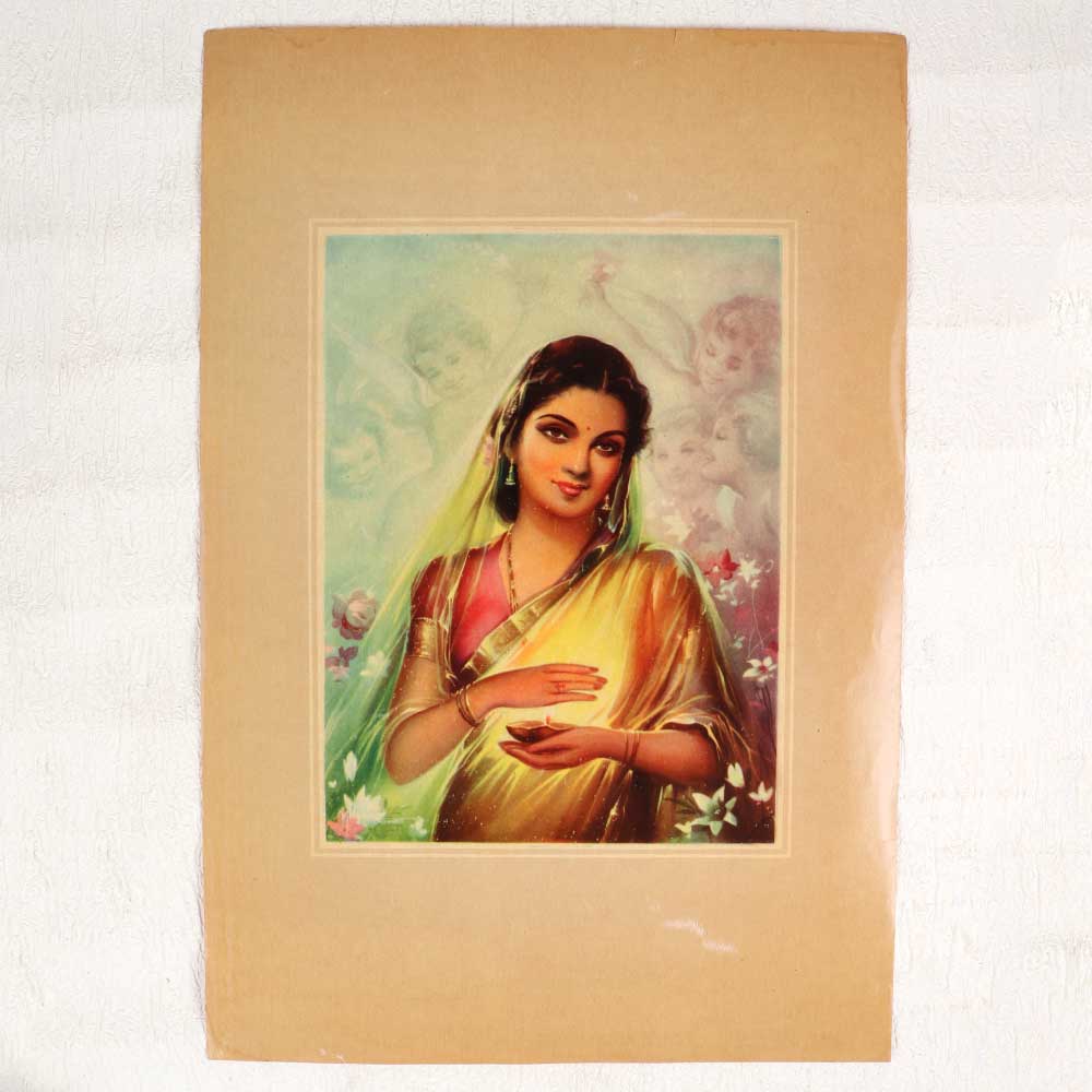 Experience old Bengal with this mesmerizing vintage oleograph print of a woman holding an oil lamp. Saturated colors and intricate designs capture an iconic tradition in stunning detail. This rare artwork is a window into the past. Its exquisite beauty ignites conversation and admiration. With every glance, feel swept away to the fascinating culture of a bygone era. Who will fall in love with this print? Those seeking vintage decor, lovers of multicultural artworks, history buffs, and anyone who appreciates exotic, eye-catching pieces. Hang this oleograph proudly on your wall to infuse your room with old-world allure. Let it spark the imagination of the sights, smells, and sounds of an ancient tradition brought to life through magnificent art. Bring home a piece of the past today.