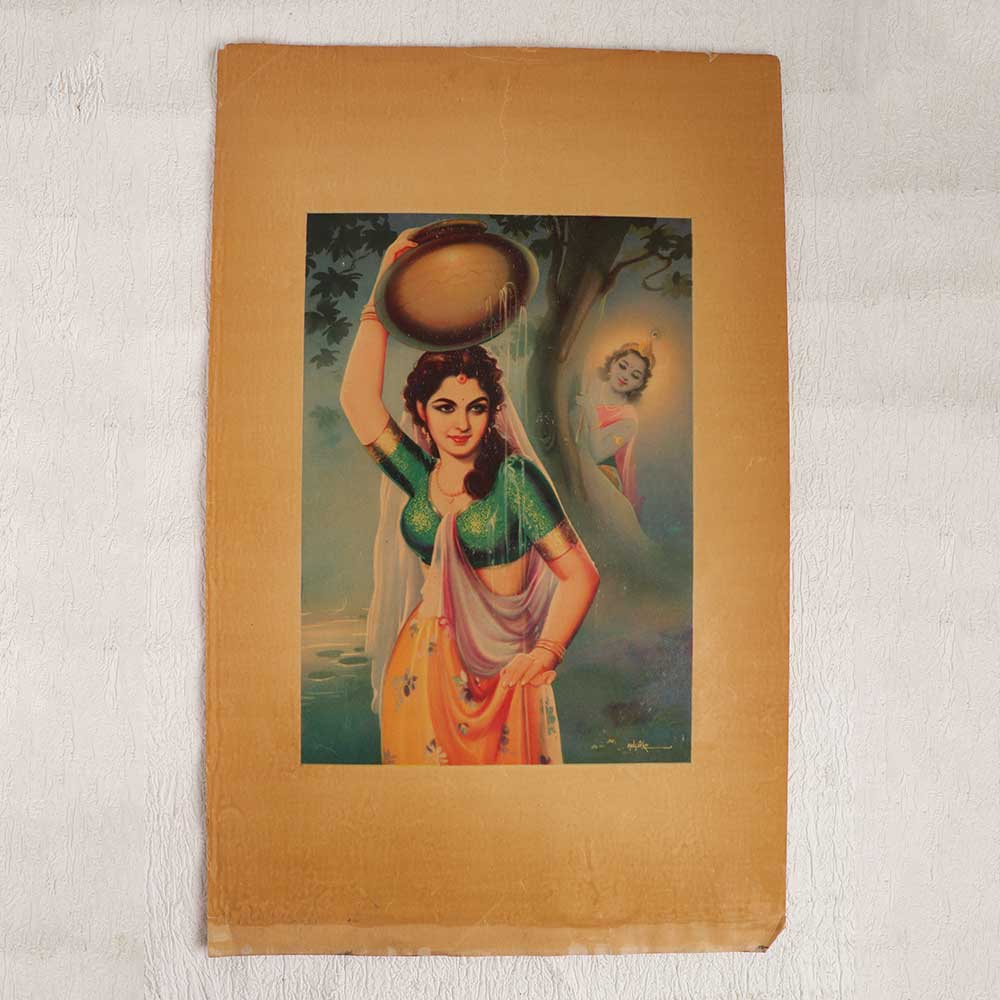 Experience the beauty, mysticism, and intimacy of Lord Krishna's divine love with this rare vintage oleograph print depicting Krishna with Gopi. Meticulously restored from an antique print, this exquisite image radiates spirituality and devotion with its intricately detailed portrayal of one of Hinduism's most significant deities. This antique oleograph print allows you to infuse your home with vintage appeal and profound spiritual symbolism. Prominently display it on your puja altar to focus your daily worship, or hang it in your living room, bedroom, or office as an inspiring focal point. Ideal for Hindus, history buffs, and vintage decor lovers who want to surround themselves with divine presence, old-world charm, and cultural heritage. This rare oleograph print is a must-have focal piece.