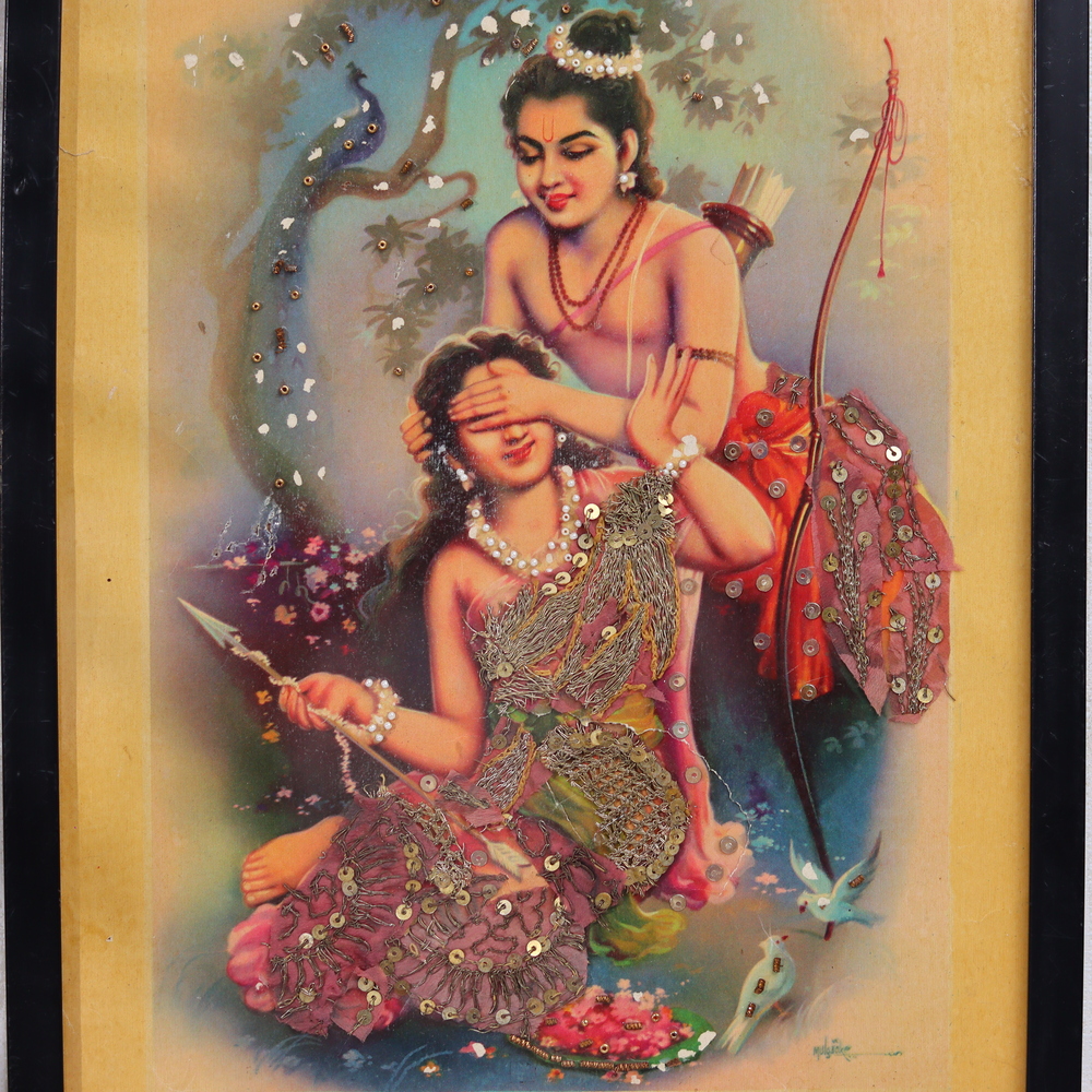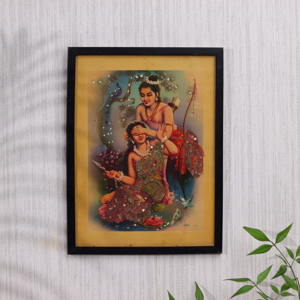 Step into the heart of India's rich artistic tradition with this captivating vintage print. Showcasing the revered deities Ram and Sita, this piece is a testament to the country's enduring cultural legacy. What sets this print apart is the intricate cloth work that has been seamlessly incorporated into the design. This unique element adds depth, texture, and a tactile quality to the artwork, inviting you to explore the intricate details with your own hands. Meticulously crafted between 1930-1940, this vintage piece is a true collector's item, a window into a bygone era of artistic mastery. Whether you're an art enthusiast or simply seeking to infuse your living space with a touch of cultural elegance, this vintage print is a must-have. Imagine the conversations and connections it will inspire as a focal point in your home. As you and your guests admire the captivating imagery, you'll be transported to a world of timeless beauty and rich cultural heritage. Display this stunning artwork with pride and let it become a cherished part of your personal collection. Immerse yourself in the captivating details and let this vintage print ignite your appreciation for the enduring artistry of India.