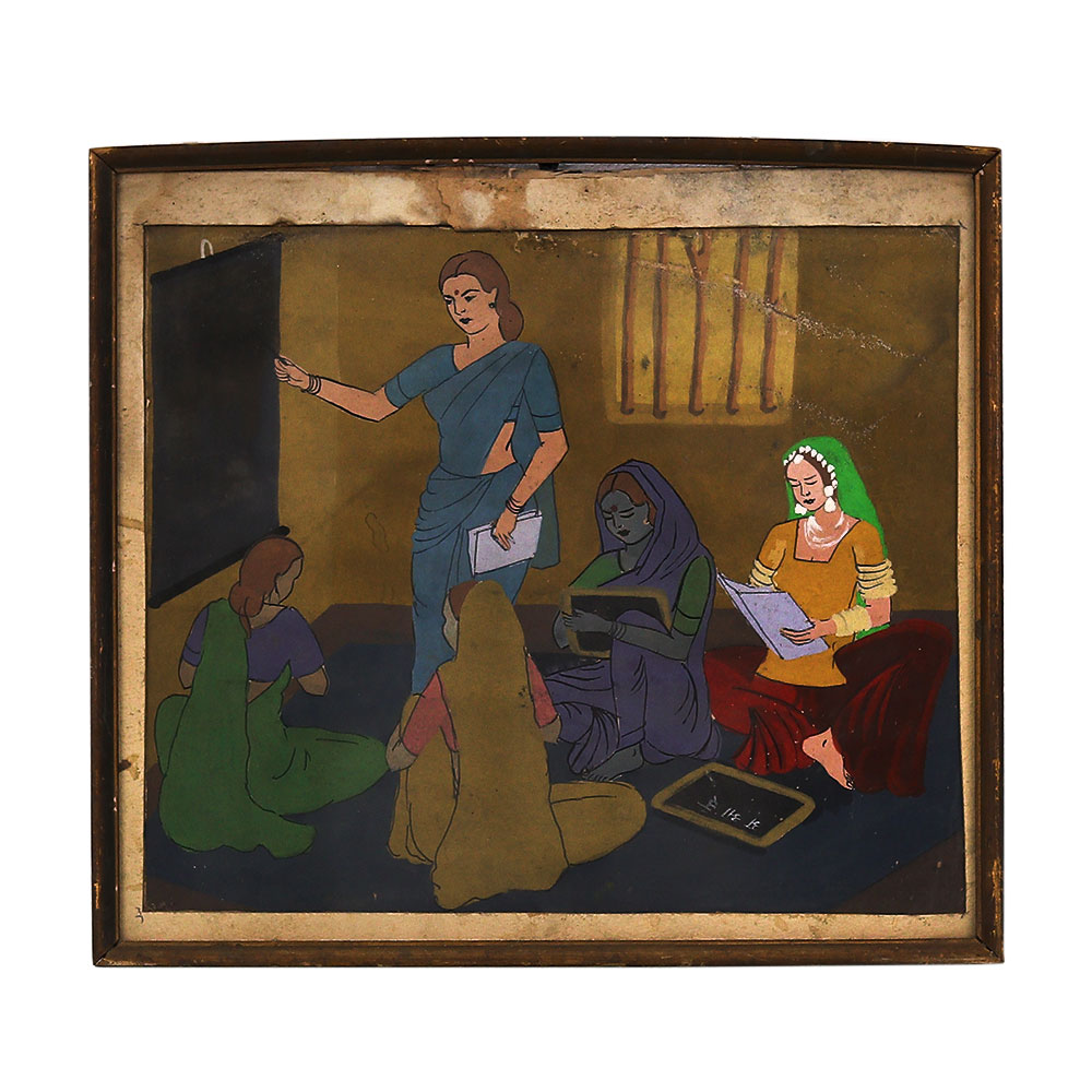 This captivating vintage paper painting transports you to a bygone era, preserving a poignant moment of cultural wisdom and tradition. Rendered with exquisite detail, the scene depicts a teacher gently guiding a group of elderly women in a rural Maharashtra setting, their weathered faces etched with rapt attention and a thirst for knowledge. More than just a work of art, this painting is a window into India's rich cultural heritage, where education is revered as a sacred pursuit. The teacher's calm demeanor and the students' open, inquisitive expressions embody the deep-rooted respect for learning that has been passed down through generations. By displaying this piece in your home or office, you'll share that sense of timeless wisdom and tradition with all who see it. Whether you're an art enthusiast, a history buff, or simply someone who appreciates the beauty of the human experience, this vintage paper painting is a must-have. It's a stunning conversation piece that will transport you and your guests to a bygone era, sparking curiosity and wonder about the stories that lie behind each brushstroke. Meticulously crafted using traditional techniques, this painting is a true testament to the enduring power of art to preserve and celebrate our shared cultural heritage.