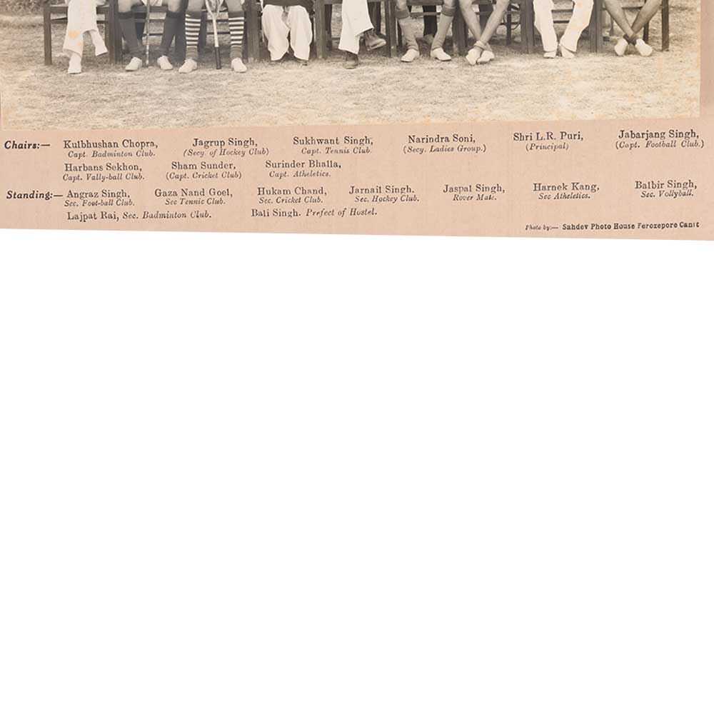 Step back in time with this captivating vintage paper photograph of the Captains and Secretaries of Clubs at Govt. College, Muktsar in 1952-53. This sepia-toned image transports you to a simpler era, with a group of smartly dressed young students posing together, full of hope and promise for the future. This historical photograph offers a fascinating glimpse into student life at Govt. College in the early 1950s. See the classic attire and hairstyles of the period, as these young scholars and leaders posed proudly together as part of the college's clubs and societies. An ideal addition to any collection of vintage Indian photographs. Bring home a piece of history with this evocative vintage photo. Ideal for those who have a connection to Muktsar, or appreciate Indian history and vintage photography. Display in your home or office as a conversation piece.
