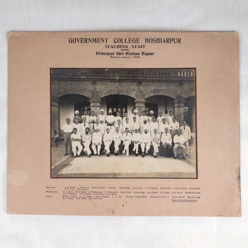 Step back in time with this stunning vintage black and white photograph of the teaching staff at Government College in Hoshiarpur, Punjab. This glimpse into the past evokes nostalgia and transports you to a simpler era. This rare photograph provides a window into the world of academia in the 1940s. See the distinguished scholars and educators who shaped young minds at this prestigious Indian college. For history buffs, those with ties to Hoshiarpur, or anyone who wants a piece of the past to display, this vintage staff photo is a must-have. Evoking nostalgia for a simpler time, it will upgrade any wall or bookshelf.