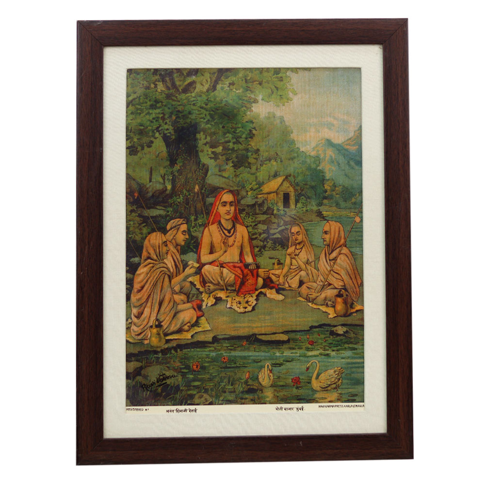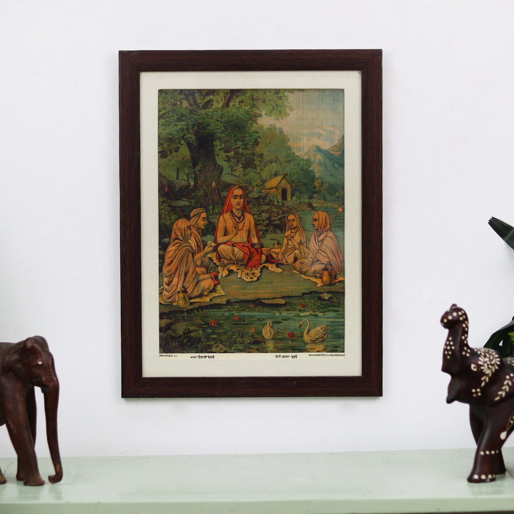 This captivating Ravi Verma print is a true work of art that will transport you and your guests to the opulent, culturally rich world of 19th century India. As one of the most celebrated Indian artists of his time, Verma's paintings are renowned for their ability to breathe life into the past through his meticulous attention to detail and masterful rendering of the human form. In this stunning oil painting, Verma has immortalized the grace, beauty, and elegance of a regal Indian woman adorned in the finest traditional dress and jewelry. The vibrant jewel-toned colors of her sari almost seem to shimmer, while the intricate folds of the fabric and the sparkle of her gems are captured with the utmost precision. The woman's serene, dignified expression radiates a timeless allure that will captivate all who behold it. Displaying this museum-quality piece in your home is like having a piece of India's majestic cultural heritage on your walls. It will infuse your space with a sense of refined sophistication and timeless beauty, transporting you and your guests to another era. This is your chance to own a true masterpiece that will be cherished for generations.
