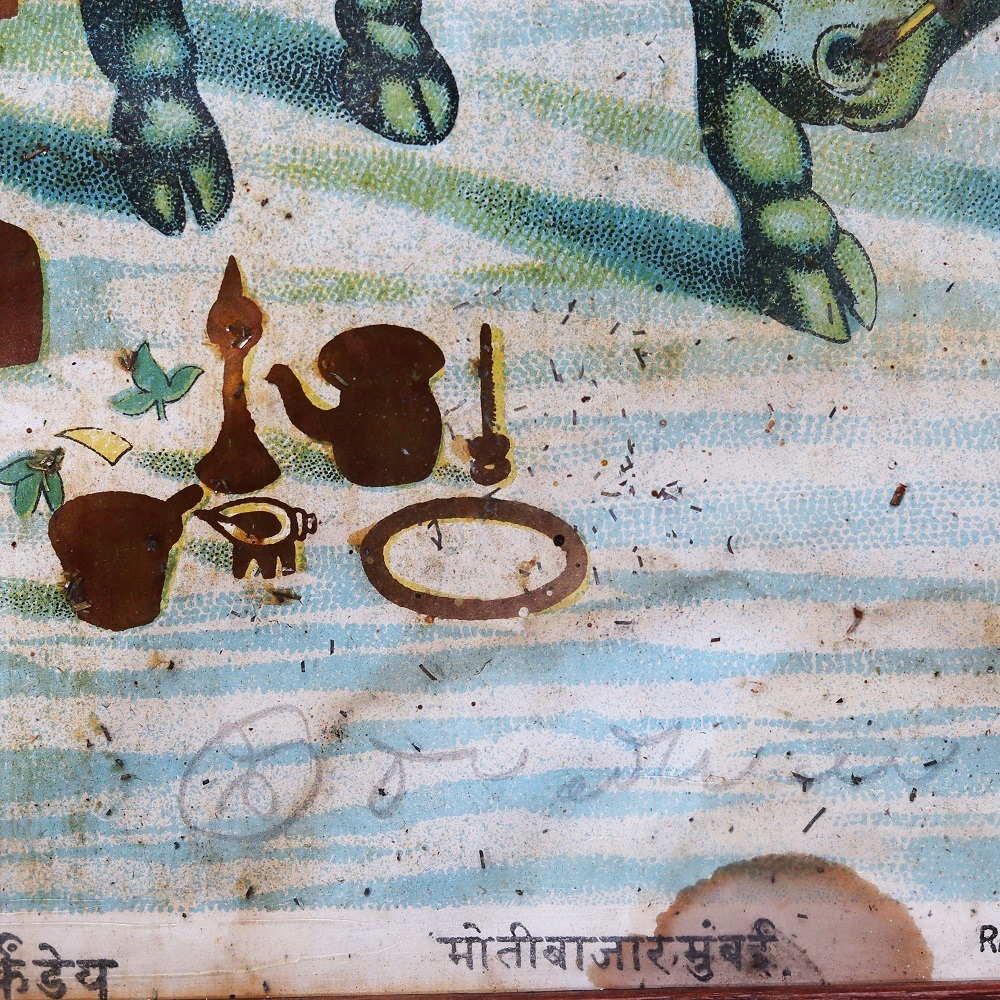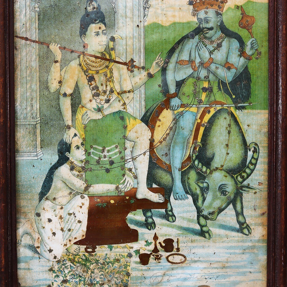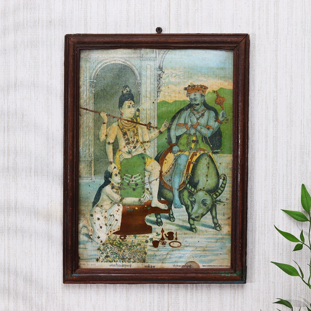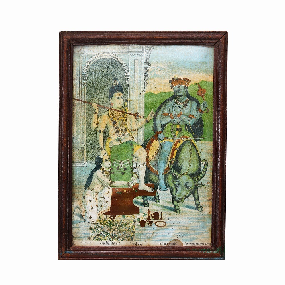 Indulge in the timeless elegance of a true artistic masterpiece with this exquisite original paper print from the legendary Ravi Verma press. Adorned with delicate silver accents that shimmer against a vintage backdrop, this captivating work of art is a testament to the enduring power of Indian cultural heritage, inviting you to step into a world of unparalleled beauty and refinement. Imagine the awe-inspiring moment when you unveil this Ravi Verma original in your home or office. The intricate silver work adds a touch of opulence, while the vintage aesthetic evokes a sense of timeless sophistication that will captivate all who behold it. Whether you're a seasoned art collector or simply seeking to infuse your space with cultural richness, this piece is sure to become a cherished centerpiece that sparks conversation and admiration. This Ravi Verma masterpiece is the perfect investment for the discerning individual who values the intersection of fine art and timeless design. Immerse yourself in the captivating world of this renowned artist and let this stunning print inspire you to celebrate the enduring beauty of the past in the present, elevating your decor with a true work of art that will be treasured for generations to come.