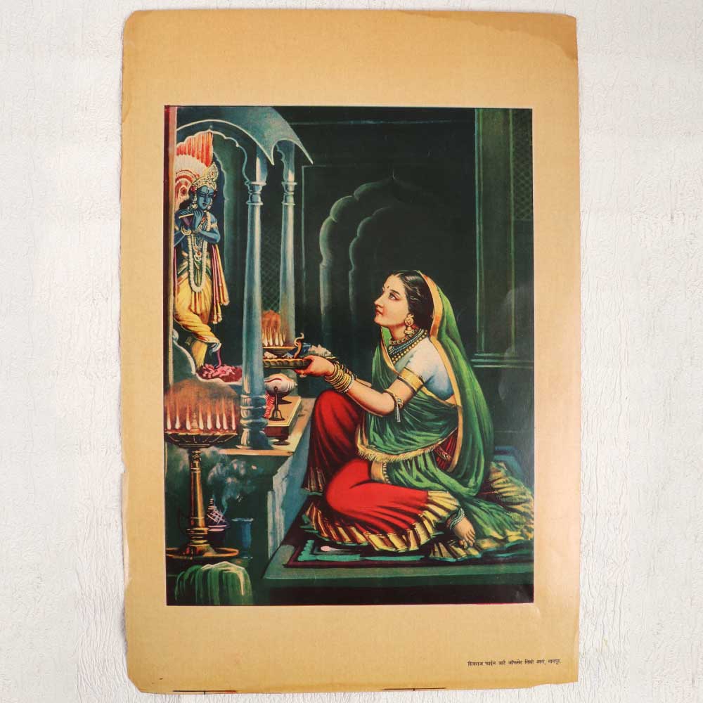 Journey to a serene world of Hindu devotion with this breathtaking vintage oleograph print depicting a traditional woman worshipping Lord Krishna. Meticulously rendered, this elegant piece captures a peaceful moment of prayer and transports you through time. The woman kneels, eyes closed and lamp held high, clad in colorful sari and bejeweled arms. Lord Krishna, known for playfulness and wisdom, is the object of her worship. The vintage style immerses you in a sacred past, inviting you to share in her meditative offering. Bring home this beautiful portrait of devotion for your wall. An inspiring gift for yogis, spiritual seekers, and lovers of vintage art, it provides a daily reminder to cultivate stillness and connection with the divine. Let its peaceful beauty fill you with tranquility.