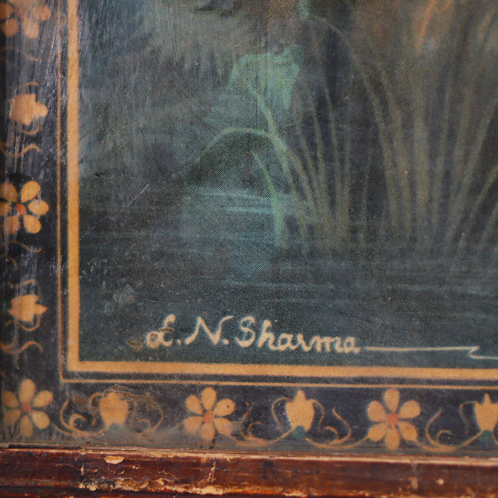 Immerse yourself in the timeless beauty and profound spiritual significance of this stunning vintage original L.N. Sharma print of Lord Vishnu. Masterfully framed in an original wooden enclosure, this captivating work of art is a true testament to the enduring power of Indian artistic tradition. The level of detail and craftsmanship on display is simply breathtaking. From the intricate patterns adorning Lord Vishnu's ornate garments to the serene, meditative expression on his face, every element of this painting has been lovingly rendered with the utmost care. It's a window into a realm of timeless spirituality that will captivate and inspire you, imbuing your living space with a sense of cultural richness and contemplative beauty. Whether you're a devoted Hindu seeking to honor your faith, an art enthusiast drawn to exceptional craftsmanship, or simply someone in search of a meaningful, visually striking piece to enhance your home, this vintage Lord Vishnu print is an absolute must-have. Invite the divine into your life and let its powerful presence enrich your daily experience.