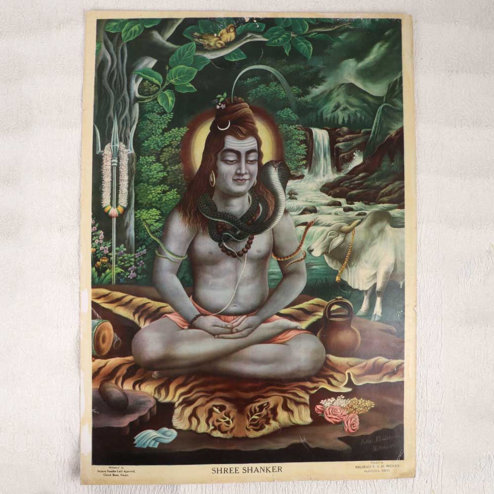 Find inner peace with this antique oleograph of meditating Lord Shiva. Vibrant 19th-century artwork radiating tranquility and divine focus. This vintage artwork promotes mindfulness, helping you center your thoughts and find your calm. An ideal focal point for a home yoga studio, meditation space or spiritual sanctuary. Let the serene imagery remind you to breathe, relax and clear your mind. A calming treasure for antique art lovers and spiritual seekers looking to infuse their space with peace.