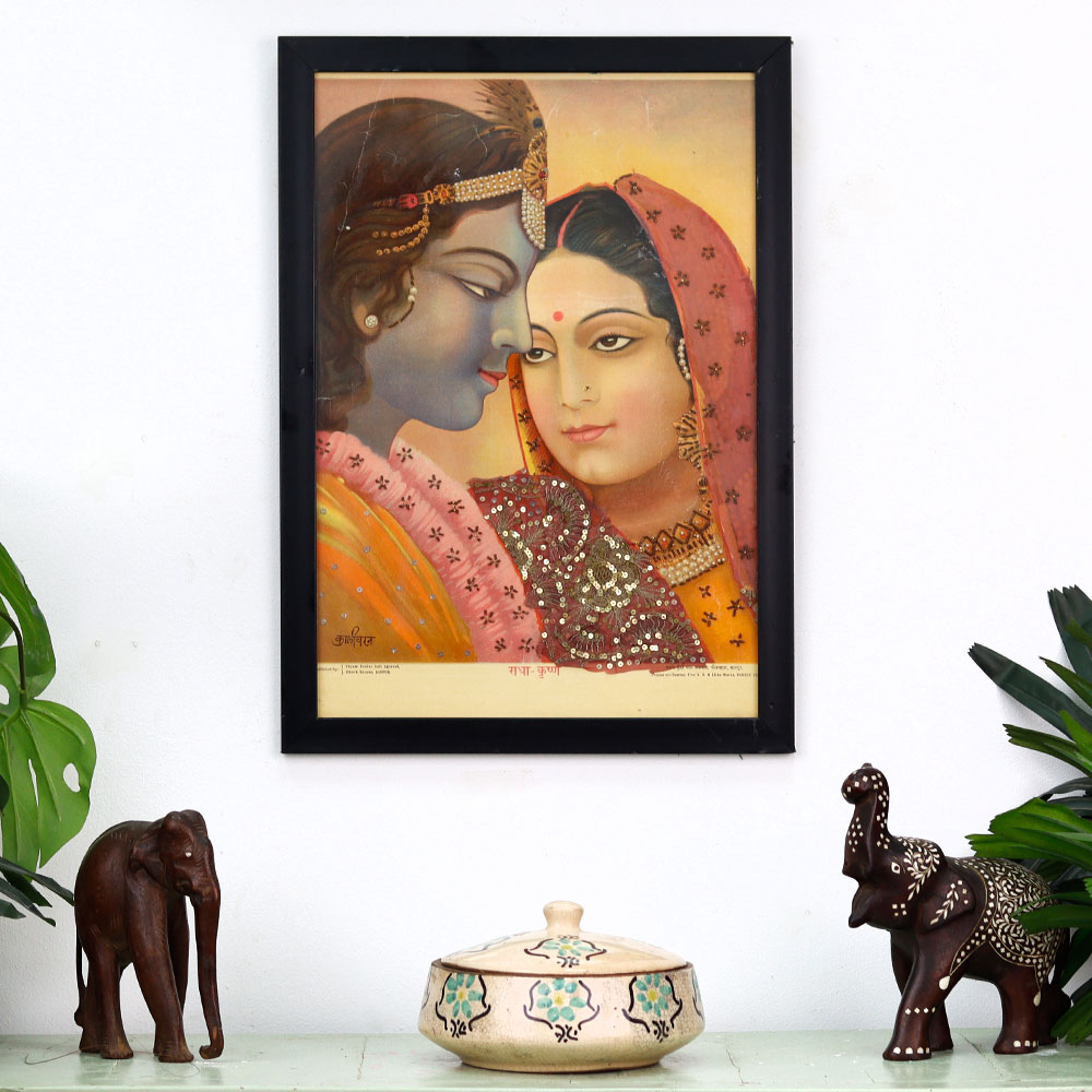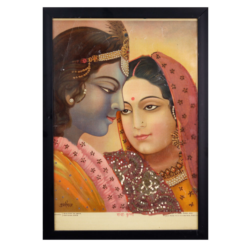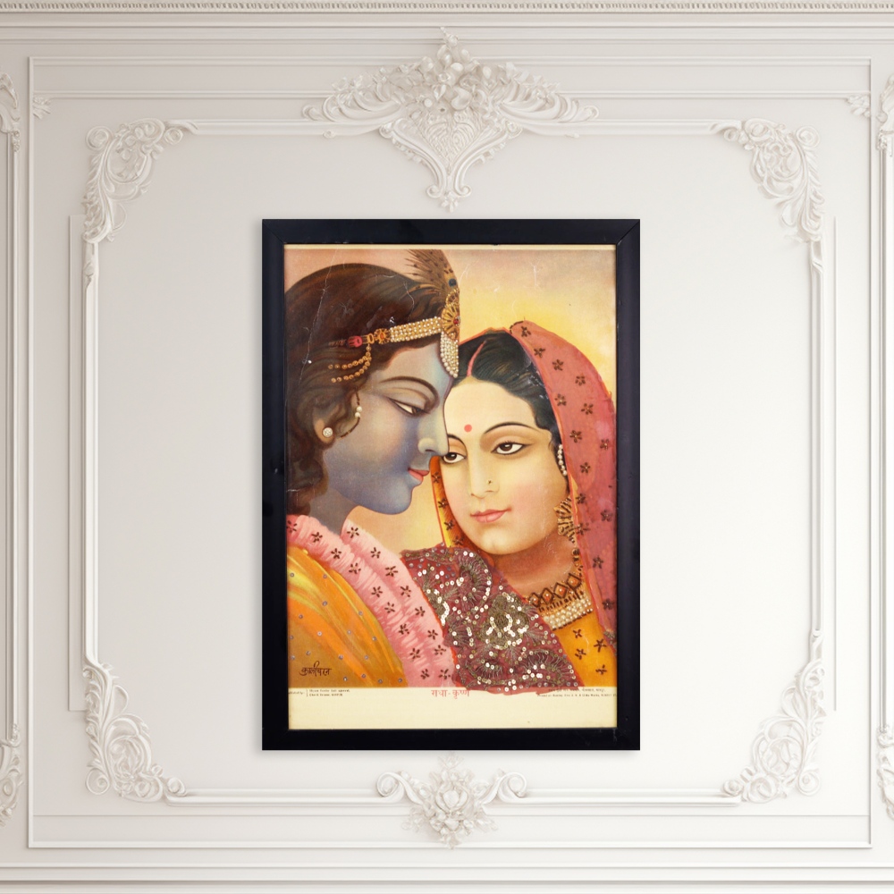 Elevate your living space with the captivating essence of this Vintage Paper Print, featuring the iconic Radha Krishna artwork of renowned Indian artist, Kali Charan. Kali Charan's masterful depiction of the divine love between Radha and Krishna is a true work of art, evoking a sense of spirituality and enchantment. The rich, jewel-toned palette and delicate brushstrokes transport you to a realm of beauty and wonder, inviting you to pause and immerse yourself in the sacred scene. Whether you're an avid collector or simply seeking to infuse your home with cultural elegance, this vintage print is a must-have. It will serve as a breathtaking centerpiece, sparking conversations and igniting the imagination of all who behold it. Invest in a timeless treasure that will be cherished for generations to come, elevating your living space with the timeless allure of this iconic artwork.