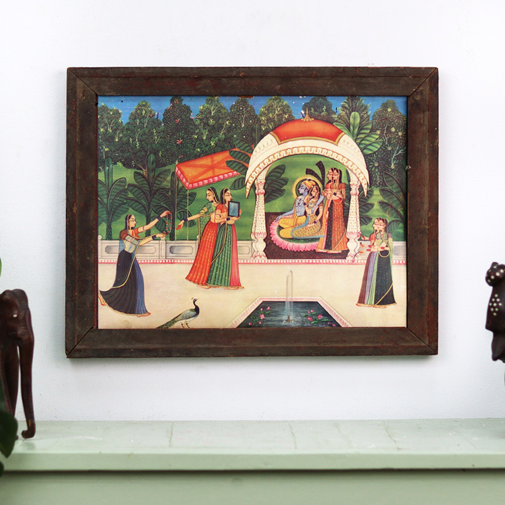 Elevate your living space with the captivating "Vintage paper print of Radha Krishna of Shingar" – a stunning work of art that celebrates the divine love between the Hindu deities. Immerse yourself in the enchanting world of the Shingar, the divine love between Radha and Krishna. This vintage paper print masterfully captures the two deities in a state of blissful union, their bodies intertwined in a graceful dance. The rich hues and delicate brushstrokes invite you to lose yourself in the sacred moment, evoking a sense of serenity and wonder. Whether you're a collector of fine art or simply seeking to infuse your home with the energy of timeless spirituality, this Radha Krishna print is a must-have. Hang it in your living room, meditation space, or bedroom to create a serene and uplifting atmosphere. Its classic wooden frame ensures a timeless, gallery-worthy display that will captivate and inspire all who behold it.