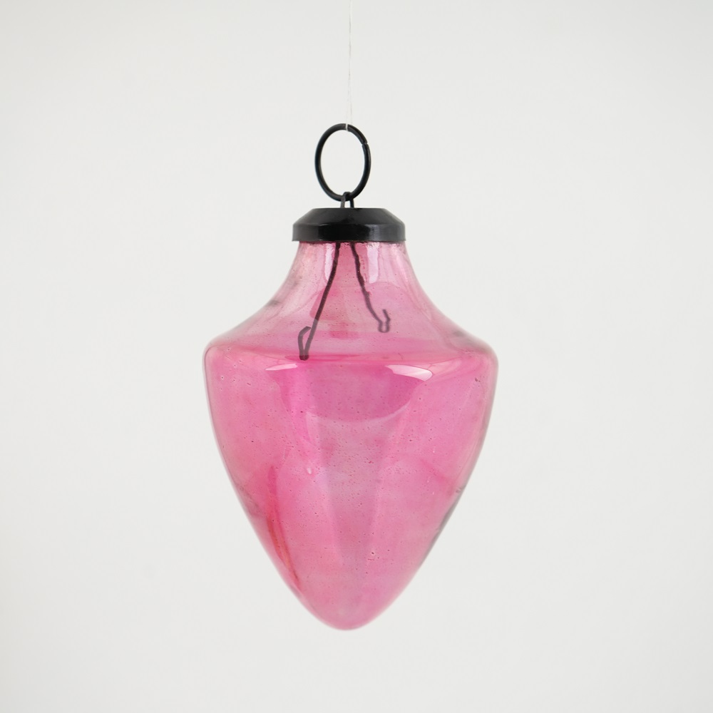 Vintage Pink Cone Shape Glass Hanging Ornament. Crafted from high-quality glass with a smooth glossy finish, this decorative bauble adds a classic and festive touch to Christmas trees, wreaths, and holiday displays.