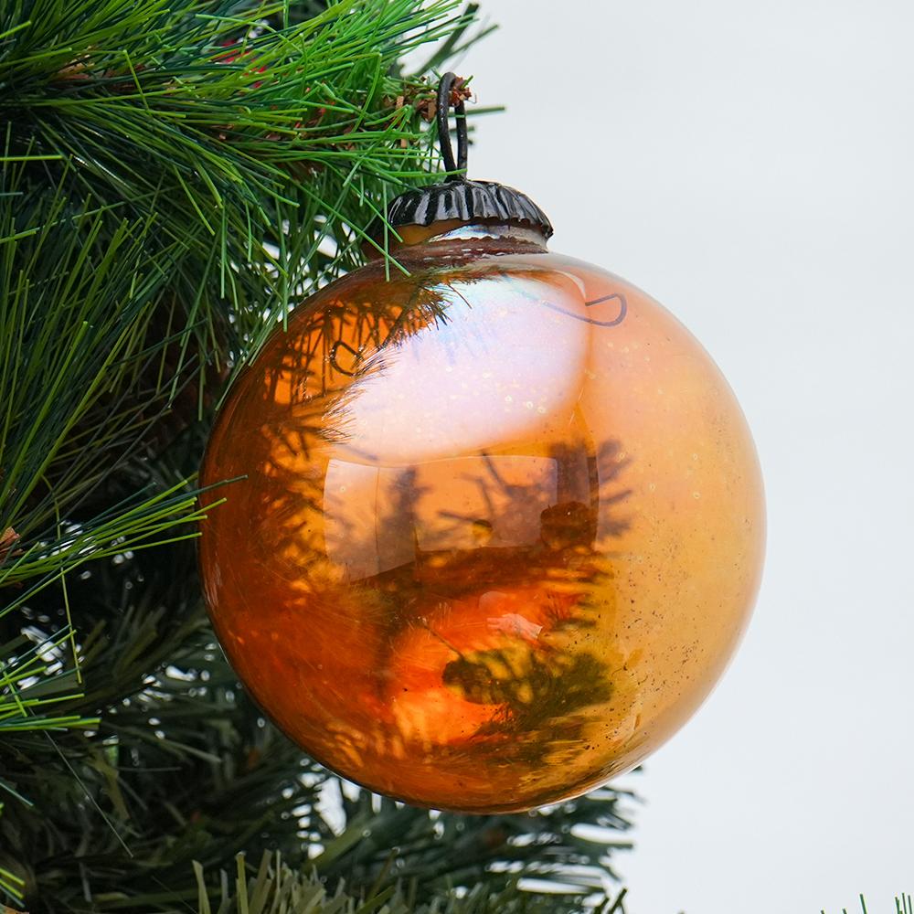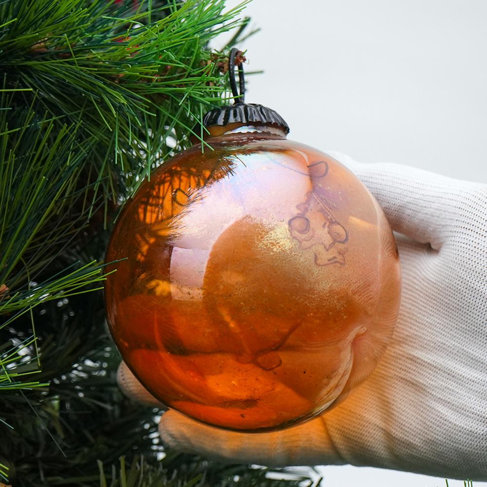 Vintage Round Amber Glass Hanging Ornament For Christmas Tree. Crafted from high-quality glass with a smooth glossy finish, this decorative bauble adds a classic and festive touch to Christmas trees, wreaths, and holiday displays.