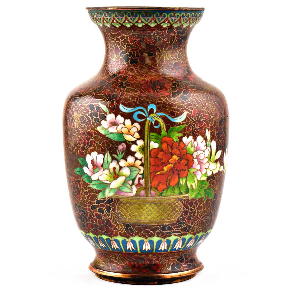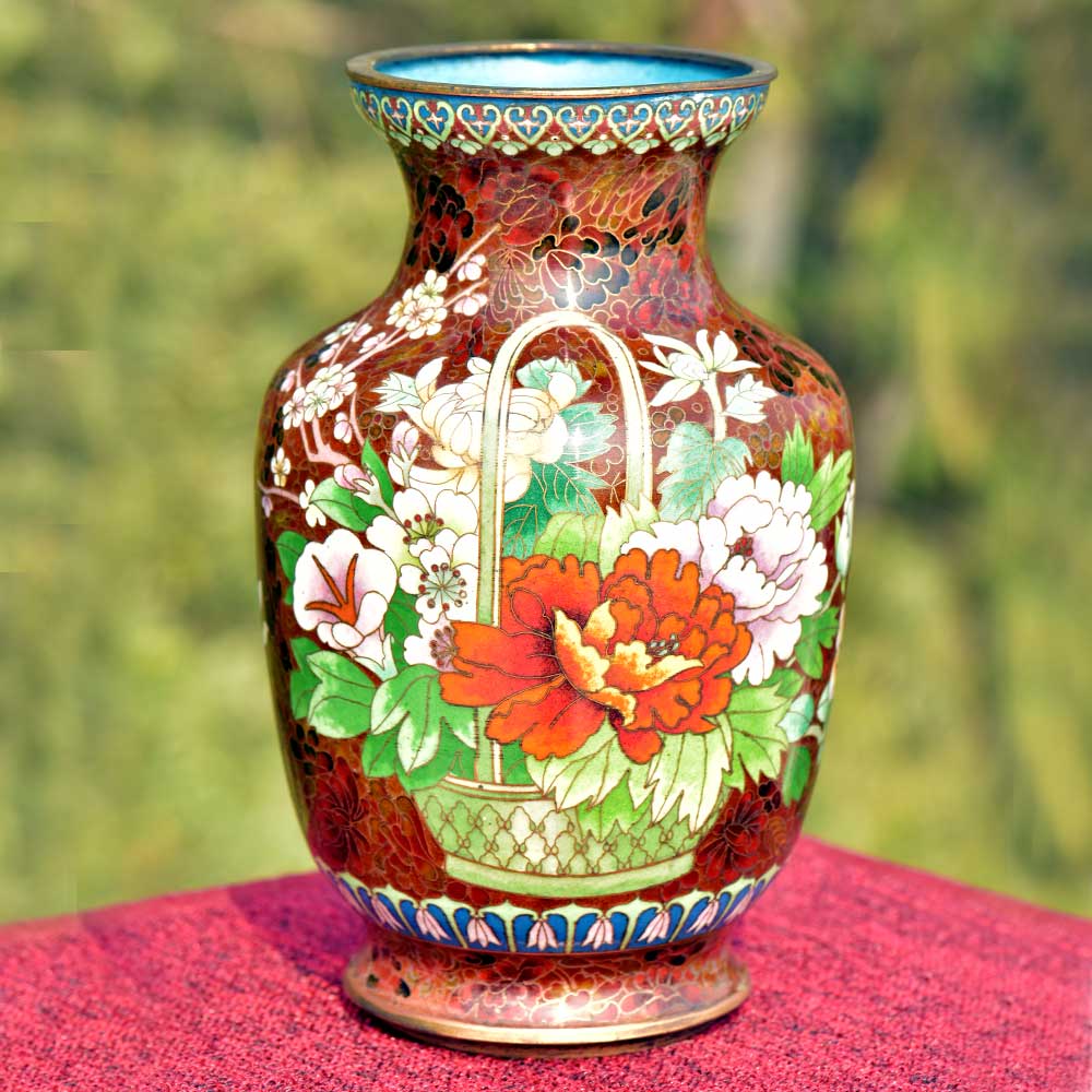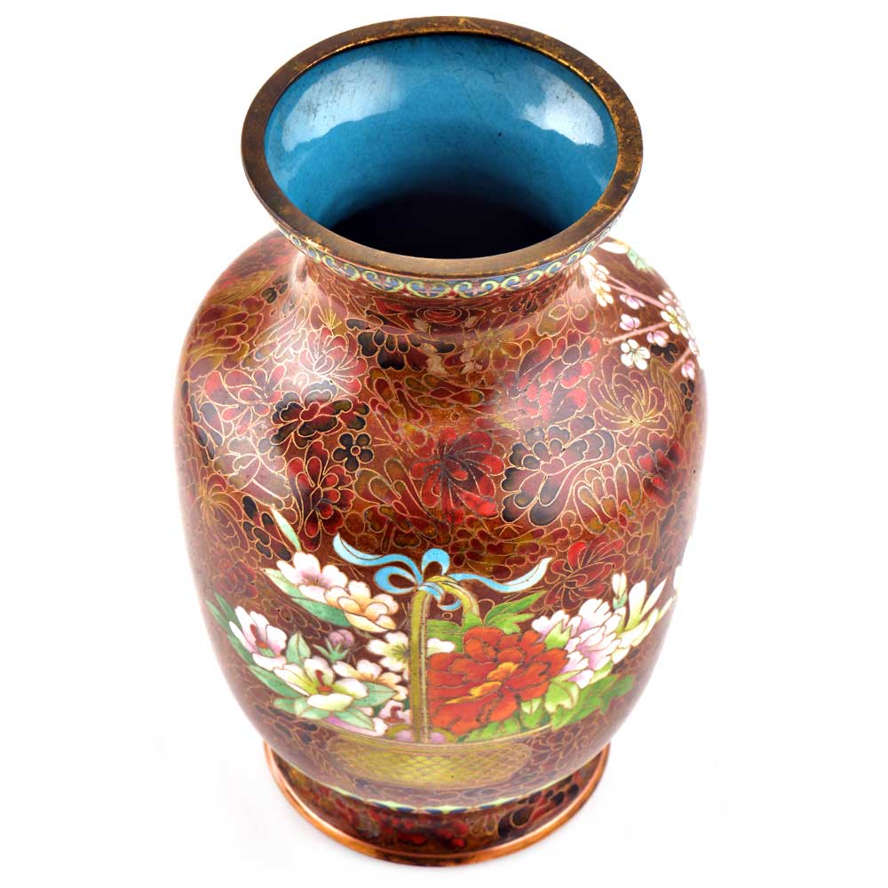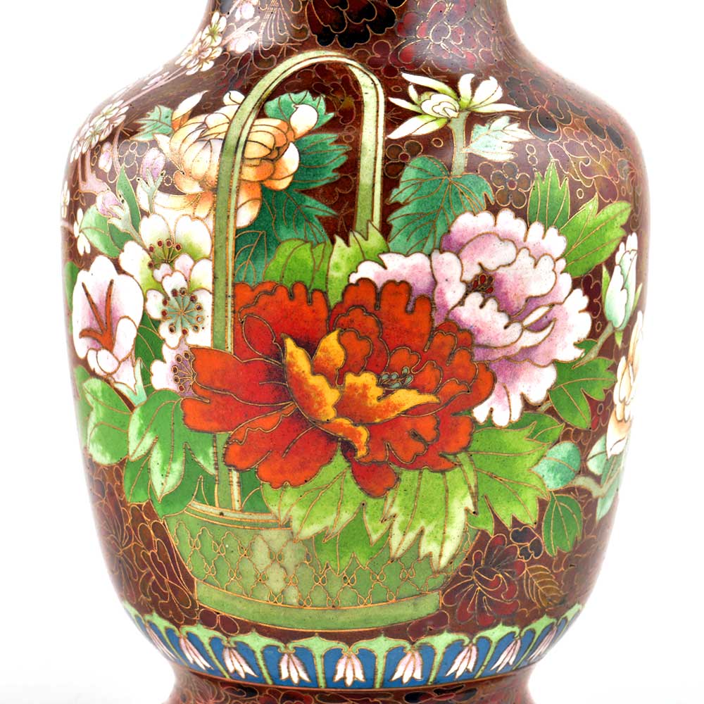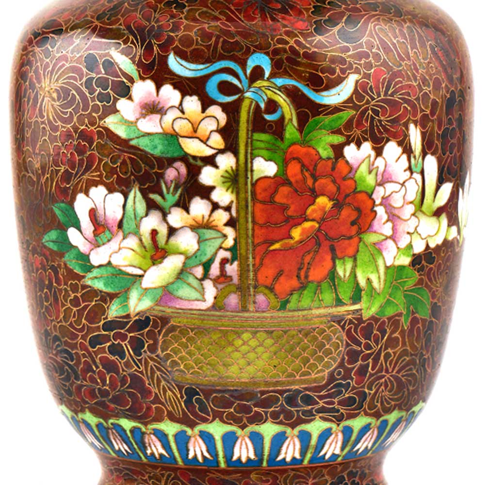 Decorative enameled metal ware called cloisonné exhibit almost superhuman skill by master craftsmen displayed by the marvelous diversity, intricacy and beauty of their designs. Earliest decorative motifs include cloud patterns, lotus flowers, the symbol of purity and beauty later motifs included dragons amid clouds, floral landscapes, scenes from court and mystical animals. Exquisitely detailed petals and leaves with fine color gradations. Fine inlaid wirework at neck and base, which are edged in brass. Exquisitely detailed petals and leaves with fine color gradations. Dark cobalt blue ground with white, rust, orange, yellow, and mauve blossoms; foliage in shades of green edged in rust are some of the popular designs of cloisonné.