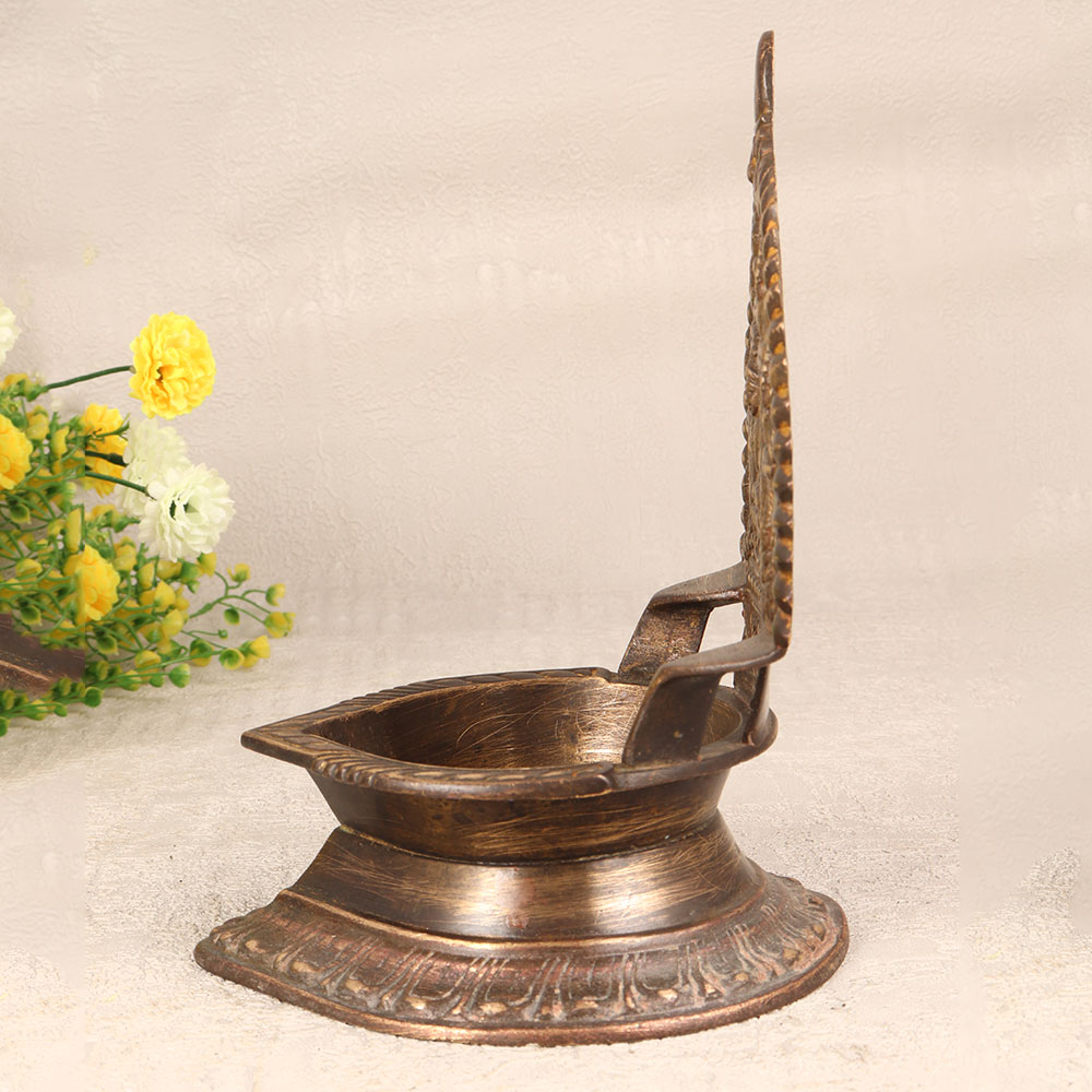 Celebrate the essence of tradition and spirituality with our Vintage Brass Gajlaxmi Oil Lamp. Crafted by skilled Indian artisans in the timeless South Indian art form, this diya pays homage to Goddess Gajlaxmi, beautifully carved onto its surface. The antique brown finish adds an air of antiquity, making it a captivating addition to any space. Made from high-quality brass, this lamp is a testament to both craftsmanship and cultural richness. Illuminate your surroundings with the warm glow of mustard oil or ghee, using a traditional cotton wick. Its versatility allows it to grace the sacred corners of your home, office, restaurant, hotel, or cafe prayer room, creating an ambiance of tranquillity. Perfect for both decor enthusiasts and spiritual seekers, this lamp seamlessly blends functionality with aesthetic appeal. Elevate your vintage collection or present it as a thoughtful gift to your family, friends or relatives on special, festive, or auspicious occasions.