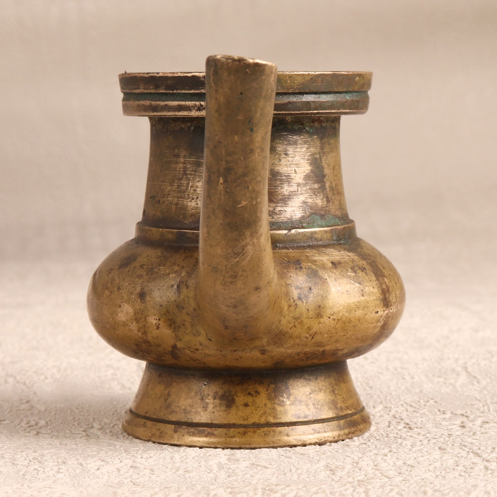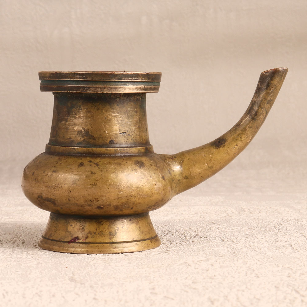 A Brass Sagar Pot with Spout which is a sacred vessel crafted with precision by highly skilled Indian artisans embodying the essence of South Indian artistry. This holy water pot is handmade from high-quality brass, showcasing an antique brown finish that exudes warmth and authenticity. Ideal for religious ceremonies, the sagar pot serves as a sacred repository for holy water during prayers, enriching spiritual moments. Beyond its religious significance, its elegant design also makes it a versatile piece for flower decoration, adding a touch of cultural charm to any setting. The antique brown finish lends an air of vintage sophistication, making it a captivating addition to home, office, restaurant, hotel, or cafe decor. This masterpiece is not only a symbol of cultural heritage but also a valuable item for collectors seeking unique artefacts. Share the joy by gifting this exquisite piece to your family, friends or relatives on special, festive, or auspicious occasions.