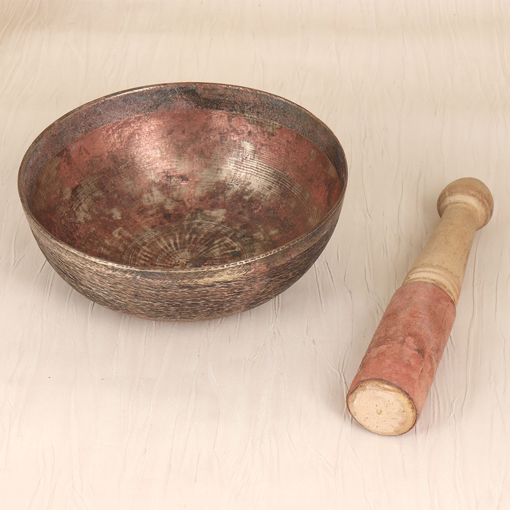 Immerse yourself in the timeless, meditative power of the om with this exquisite singing bowl. Expertly forged from a rare alloy of copper, tin, and other metals, this vintage-inspired piece emanates a hauntingly beautiful tone that will transport you to a state of profound calm and clarity. Whether you're a seasoned yogi or simply seeking a natural way to unwind, this om singing bowl is your gateway to a higher plane of consciousness. The resonant vibrations it produces trigger the body's relaxation response, lowering stress hormones and allowing your mind to drift into a blissful, meditative state. Use the included wooden mallet to effortlessly create mesmerizing tones that reverberate through your entire being, guiding you towards inner peace and spiritual enlightenment. This om singing bowl makes the perfect addition to any mindfulness practice, home meditation space, or sacred ritual. Elevate your daily routine and invite the power of the universe into your life with this stunning, one-of-a-kind singing bowl.