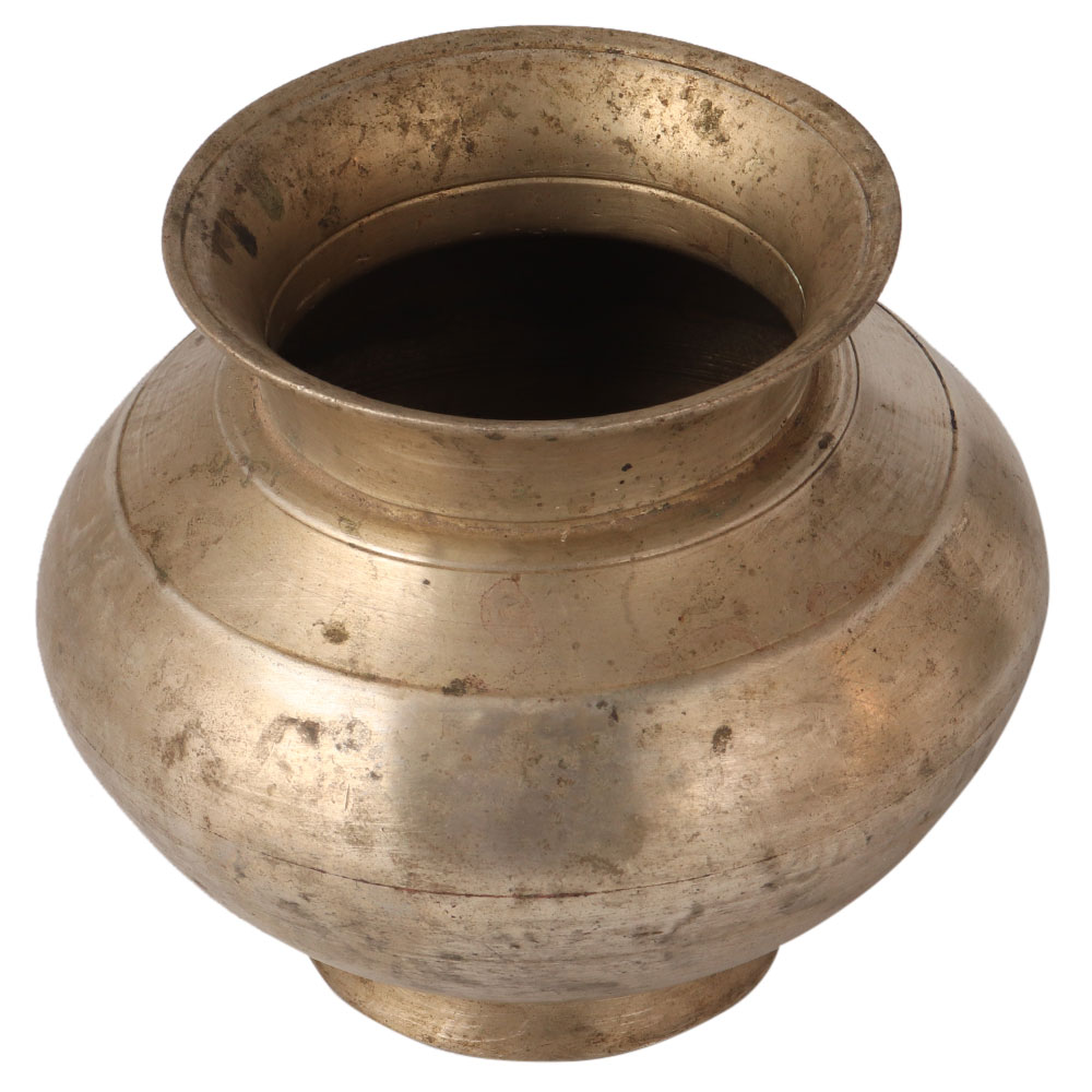 This handcrafted holy water pot has been engraved with a circular embossed ring. It has a sturdy, brownish vintage style appearance. It has a small opening with a large belly to hold holy water, rice, flowers or gold coins in rituals. It is used to welcome the newly married daughter-in-law into the home by slowly bumping the pot filled with rice.