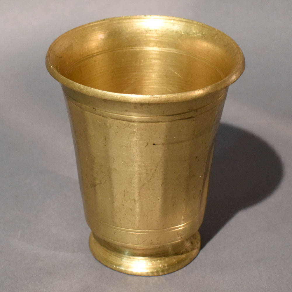This vintage style solid brass ritual tumbler reflects traditional Indian metal craftsmanship with a strong, structured silhouette and timeless appeal. Designed with a broad flared rim and a slightly tapered body, the tumbler rests securely on a thick circular base that enhances stability and presence. The clean vertical paneling effect on the surface gives it a refined architectural look while maintaining simplicity. The warm golden tone of brass is enriched by natural patina marks and subtle surface variations, emphasizing its authentic character. Fine horizontal band detailing near the rim and base adds understated ornamentation, making it suitable for both ceremonial and everyday use. The interior is smoothly finished, ensuring practical functionality for serving water, milk, herbal drinks, or sacred offerings. Brass drinkware has long been associated with traditional dining and ritual practices in Indian households. This handcrafted tumbler fits seamlessly into pooja settings, festive gatherings, temple use, or heritage-inspired table arrangements. Its sturdy pedestal base gives it a more elevated appearance compared to regular tumblers, adding ceremonial elegance. Made from solid brass using traditional shaping techniques, this piece offers durability and long-term usability. Over time, the surface develops a richer tone, enhancing its antique character while preserving structural strength.
