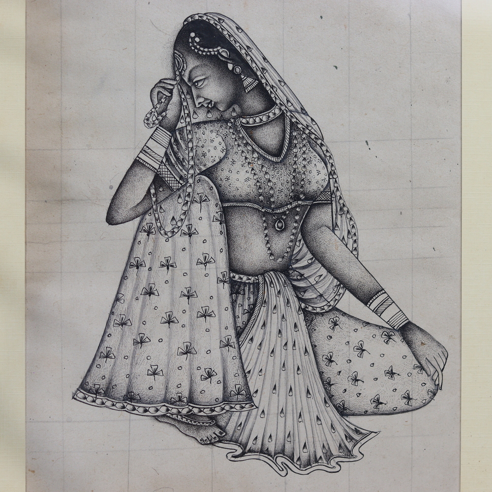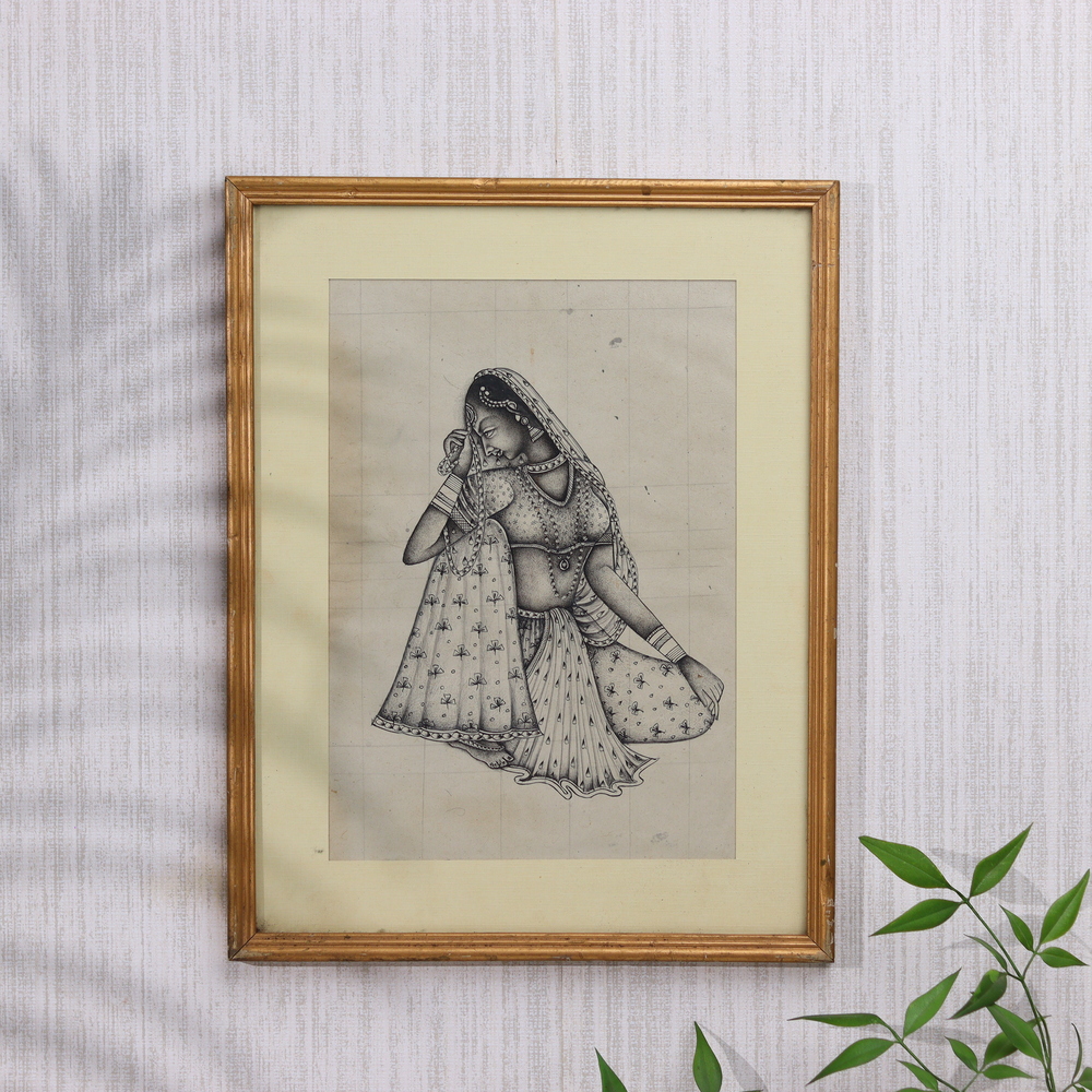 Discover the captivating allure of India's rich cultural legacy with this stunning pencil painting, featuring a serene and regal Indian woman adorned in the resplendent jewels and vibrant fabrics of a bygone era. Meticulously crafted by a skilled artist, this masterpiece invites you to bask in the timeless elegance of traditional Indian artistry. As you gaze upon this captivating work of art, allow yourself to be transported to a world of timeless beauty and cultural richness. Imagine the warm glow of the sun reflecting off the woman's bejeweled adornments, or the delicate folds of her vibrant Papering cascading gracefully around her. This pencil painting is not merely a decorative piece, but a testament to the enduring artistry and cultural significance of India. Whether you're an art enthusiast or simply seeking to infuse your living space with the elegance of India's rich heritage, this stunning pencil painting is a must-have addition to your home. Elevate your décor and immerse yourself in the captivating essence of a civilization that has enchanted the world for centuries.