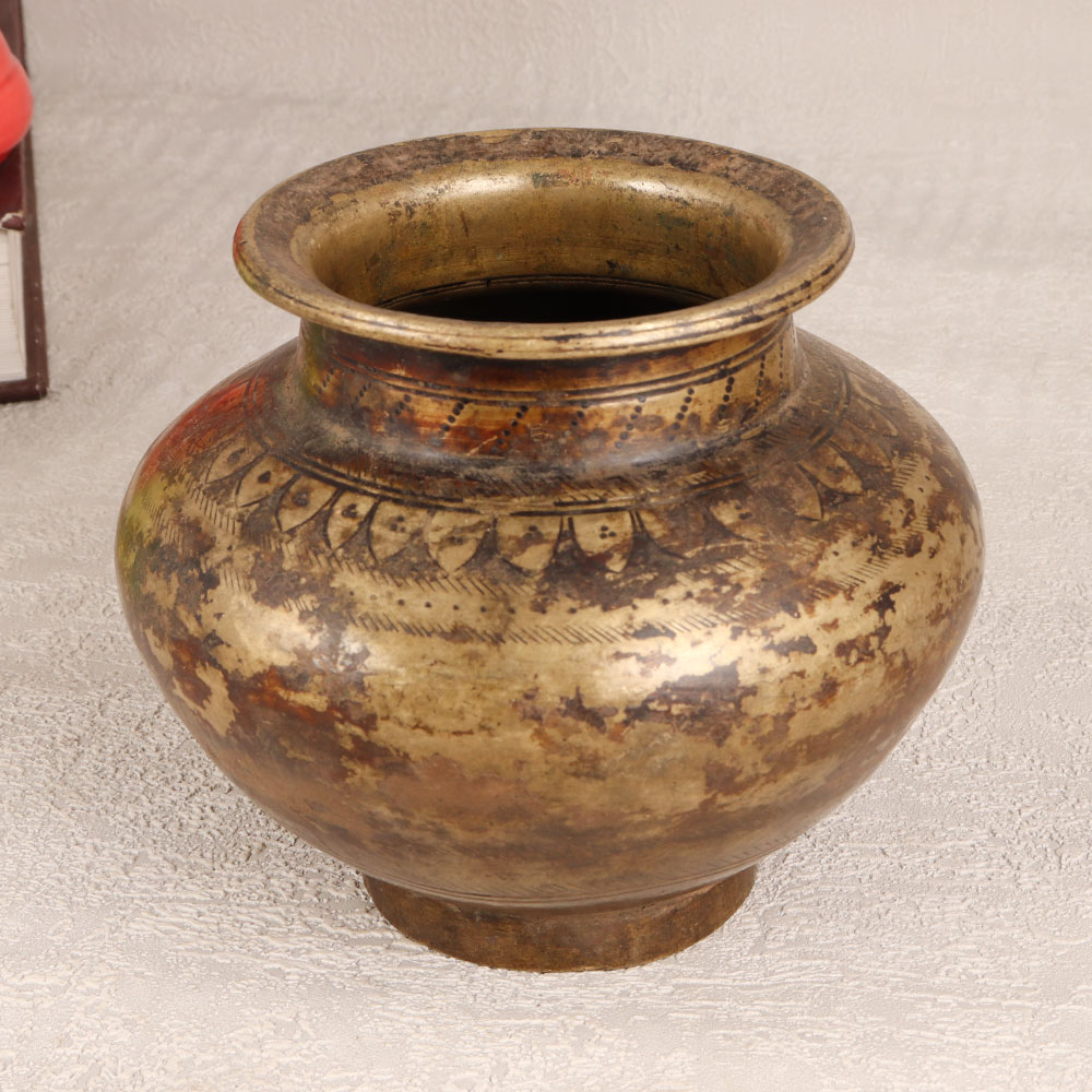 Immerse your sacred moments in the divine ambiance with this Vintage Brass Holy Water Pot. Handcrafted by skilled artisans from Gujarat, India, this masterpiece boasts intricate carvings and a warm antique brown finish that reflects the rich cultural heritage of the region. Fashioned from high-quality Brass, the pot serves as a vessel for holy water during prayers, havans, and auspicious occasions, radiating a sense of sanctity. Versatile in its utility, the pot transforms into a vessel for floral embellishments, enhancing its charm during festive celebrations. Its timeless elegance makes it a perfect addition to your home, office, restaurant, hotel, or cafe, elevating the aesthetic appeal of any space. This antique masterpiece is not merely a decorative piece but also a meaningful addition to vintage collections. Gift this ethereal creation to your family, friends or relatives on special occasions, ushering blessings and a touch of Indian craftsmanship into their lives.