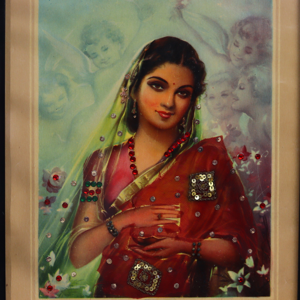Discover the timeless elegance of the East with this stunning Vintage Traditional Indian Lady painting. Bursting with intricate details and rich, warm tones, this captivating artwork will transport you to the heart of the Indian subcontinent. This painting is a masterful blend of cultural tradition and artistic brilliance. The subject's poise and grace command attention, while the ornate cloth decor work surrounding her adds layers of visual interest and cultural significance. Whether you're drawn to the vibrant history and rich artistry of India or simply appreciate fine art, this painting is a must-have addition to your home. Invite the beauty and wonder of the East into your living space. This Vintage Traditional Indian Lady will elevate your decor while sparking curiosity and intrigue in all who lay eyes on it. Display this captivating artwork, and let it transport you to the bustling markets and serene temples of India with each glance. Surround yourself with the timeless elegance of the East and let this painting inspire you to explore the rich cultural tapestry of India.