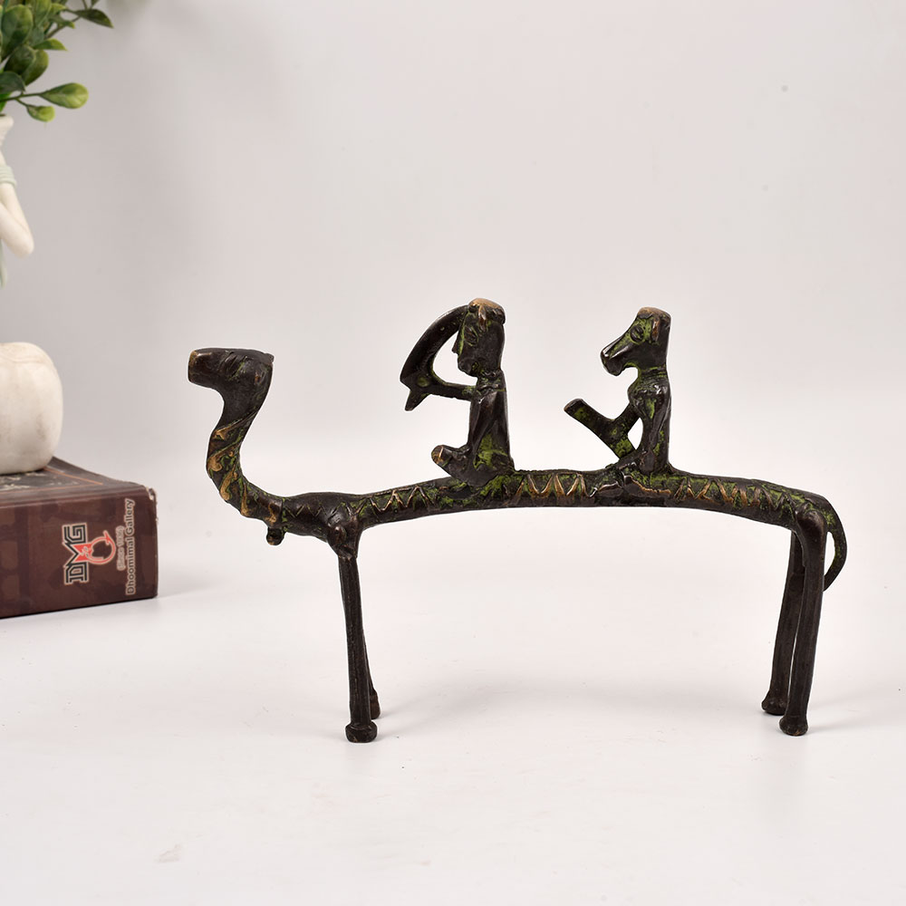 Immerse yourself in the captivating allure of the Arabian desert with this stunning brass camel sculpture. Meticulously crafted by skilled artisans, this piece showcases the rich heritage and artistic mastery of tribal cultures. The solid brass construction ensures it will maintain its breathtaking appearance for years to come, while the two riders atop the camel's back add a touch of adventure and exploration. Whether you're a seasoned collector of tribal art or simply seeking to infuse your home with a sense of exotic elegance, this brass camel sculpture is a must-have addition. Display it prominently in your living room, study, or entryway, and let its majestic presence transport you to the heart of the desert. With its intricate detailing and captivating silhouette, this sculpture will captivate all who lay eyes upon it, elevating the ambiance of any room and inspiring a sense of wonder and adventure.