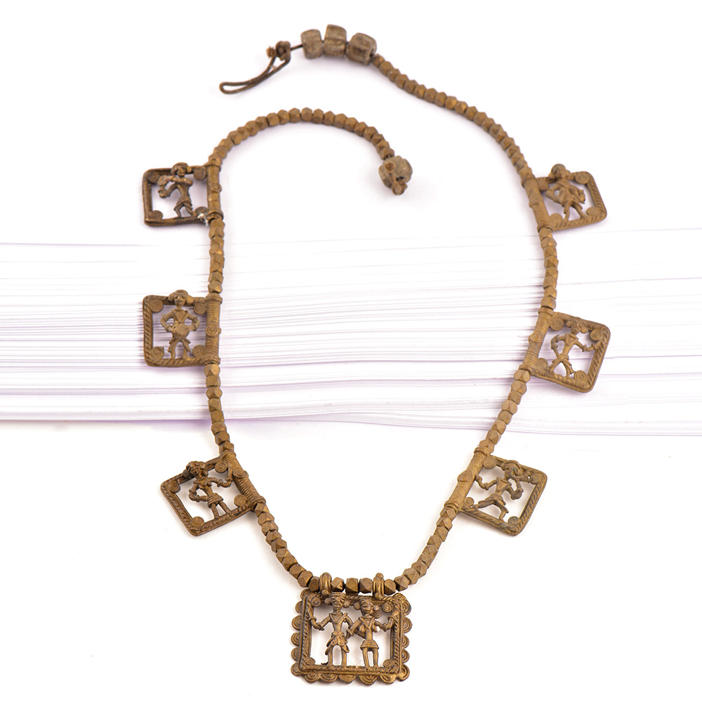 The Vintage Tribal Necklace Brass Chain with Tribal Figures celebrates the ancient artistry of Indian metalwork through intricate design and cultural symbolism. Cast in antique-finished brass, the necklace features miniature tribal figures that narrate tales of heritage, unity, and craftsmanship. Its earthy tones and textured detailing make it an expressive piece that bridges history with style — a true collector’s ornament for those drawn to soulful, handcrafted jewelry.