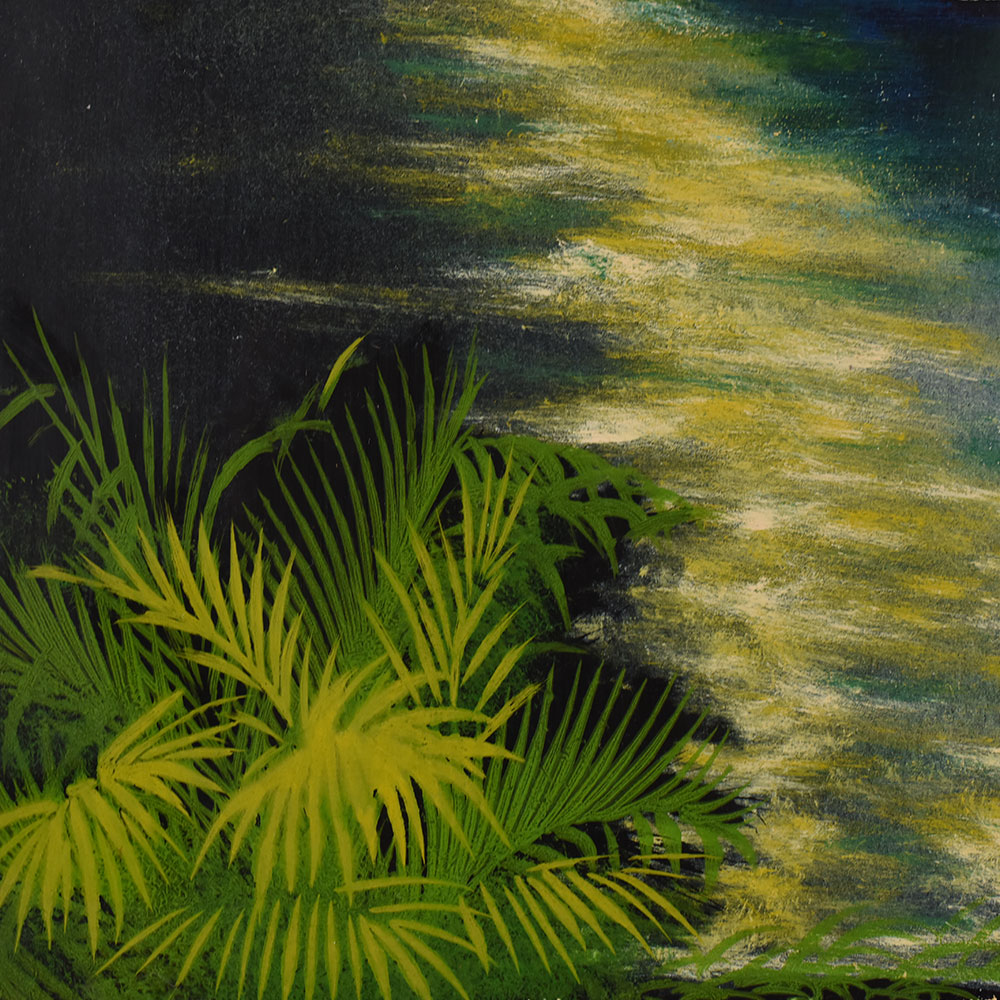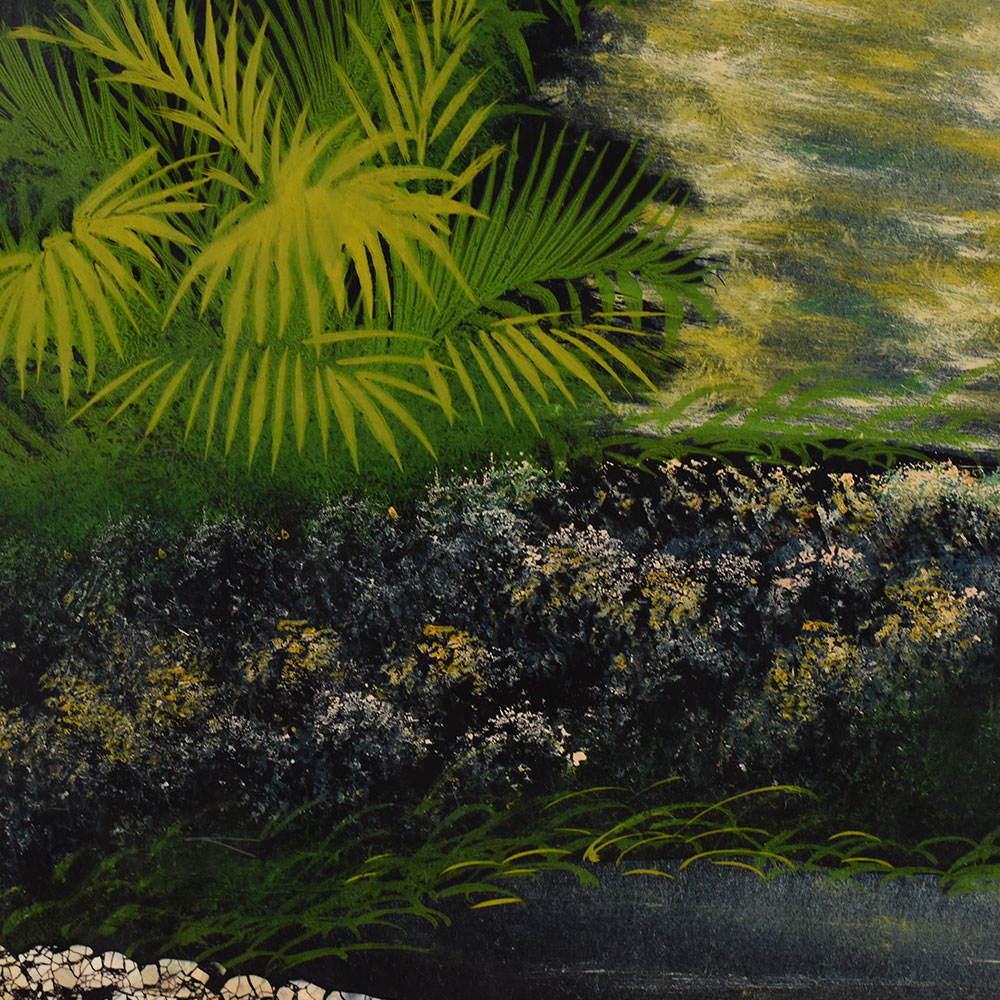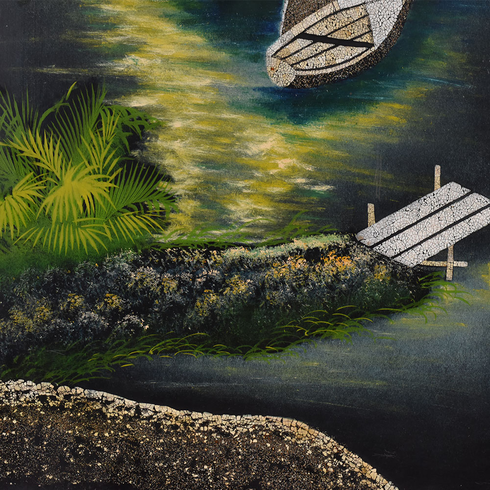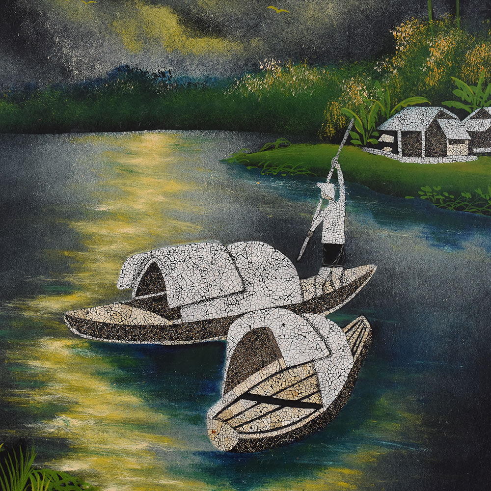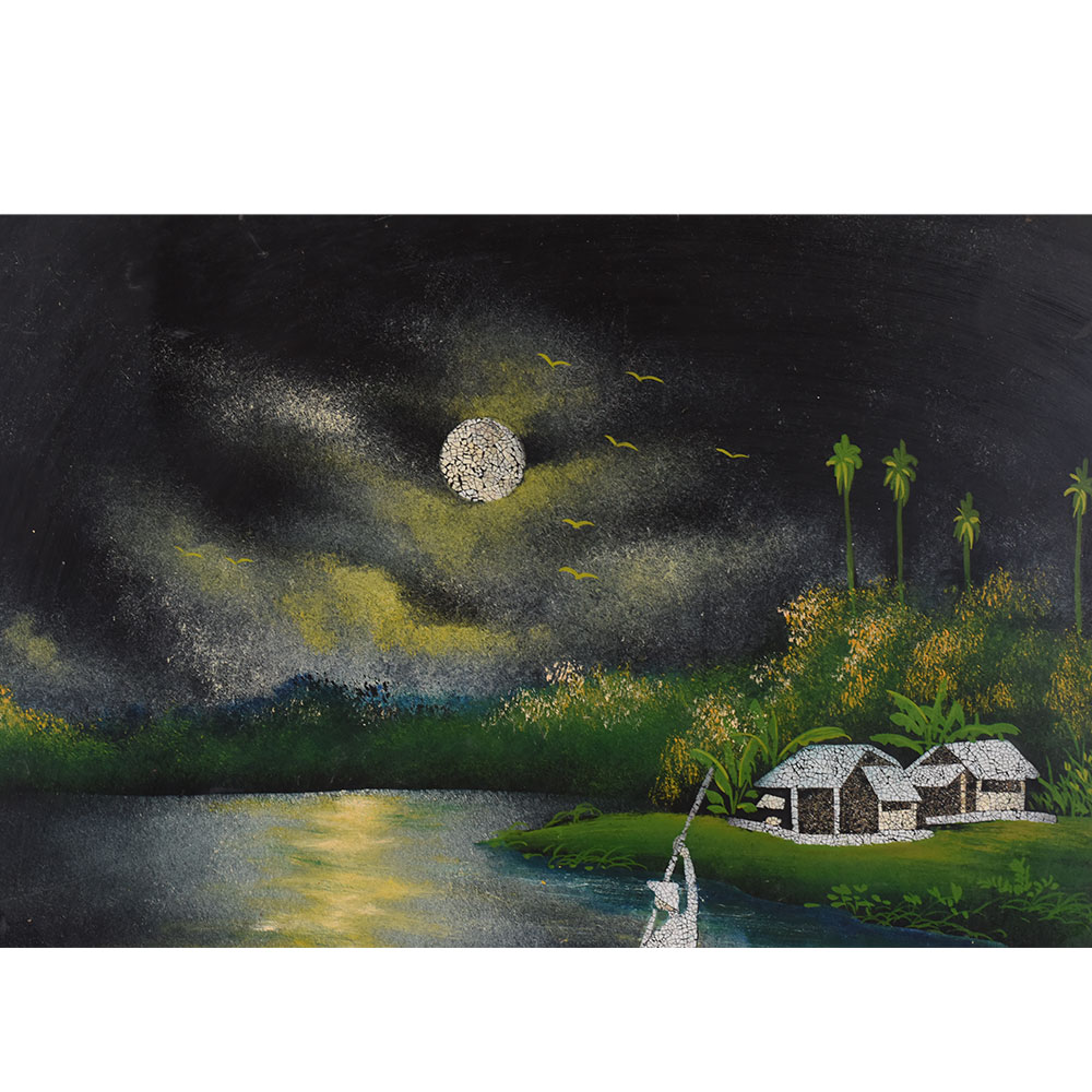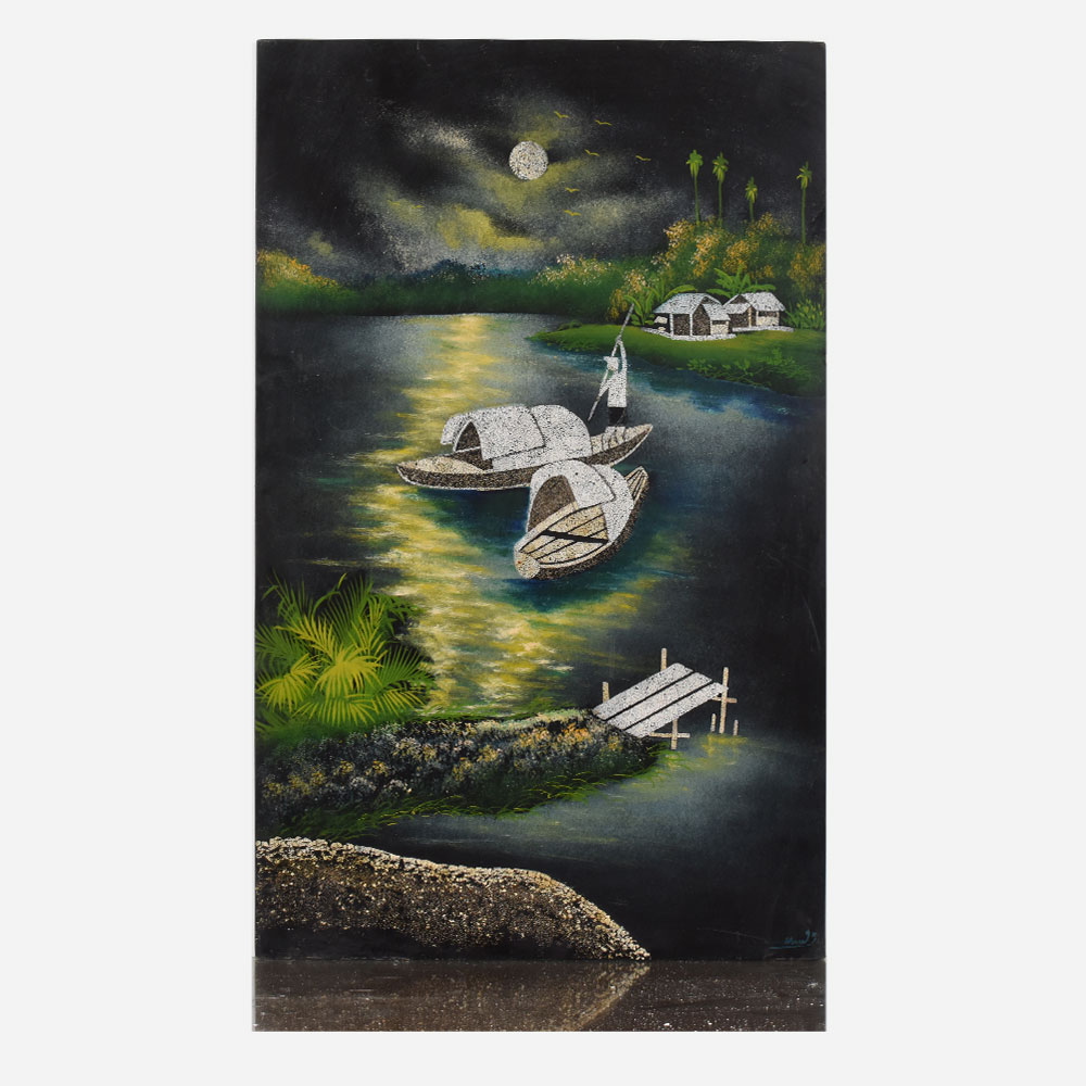 This beautiful vintage velvet painting on hardboard captures a serene moonlit river scene with traditional boats, lush greenery, and village huts in the background. The shimmering reflection of the moon on the water highlights the artist’s unique technique, creating depth and a dreamlike effect that velvet paintings are renowned for. The presence of wooden boats and a riverside dock evokes the charm of rural life, making this artwork both nostalgic and captivating. With vibrant contrasts and detailed brushwork, it is an excellent collectible piece for vintage art enthusiasts and interior decorators who value cultural and natural themes. This painting not only showcases traditional craftsmanship but also tells a story of peace, nature, and simple living. Ideal for home, office, or gallery display, it adds warmth and vintage charm to any space.