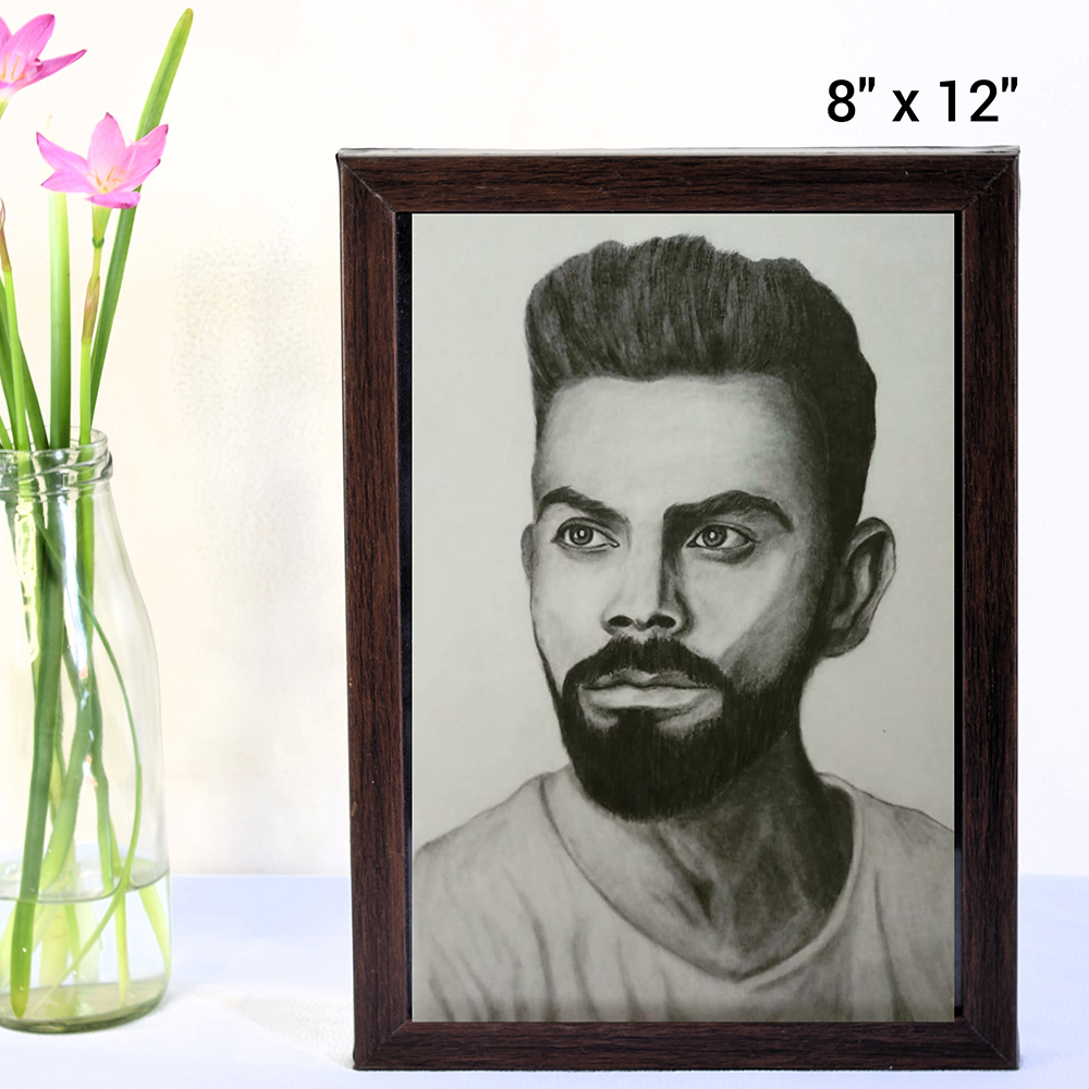 A hyper-realistic pencil portrait of Virat Kohli, drawn by Artist Dimpana. This artwork beautifully captures the cricketer's sharp features and composed expression, rendered with expert shading and detail on fine-quality paper.