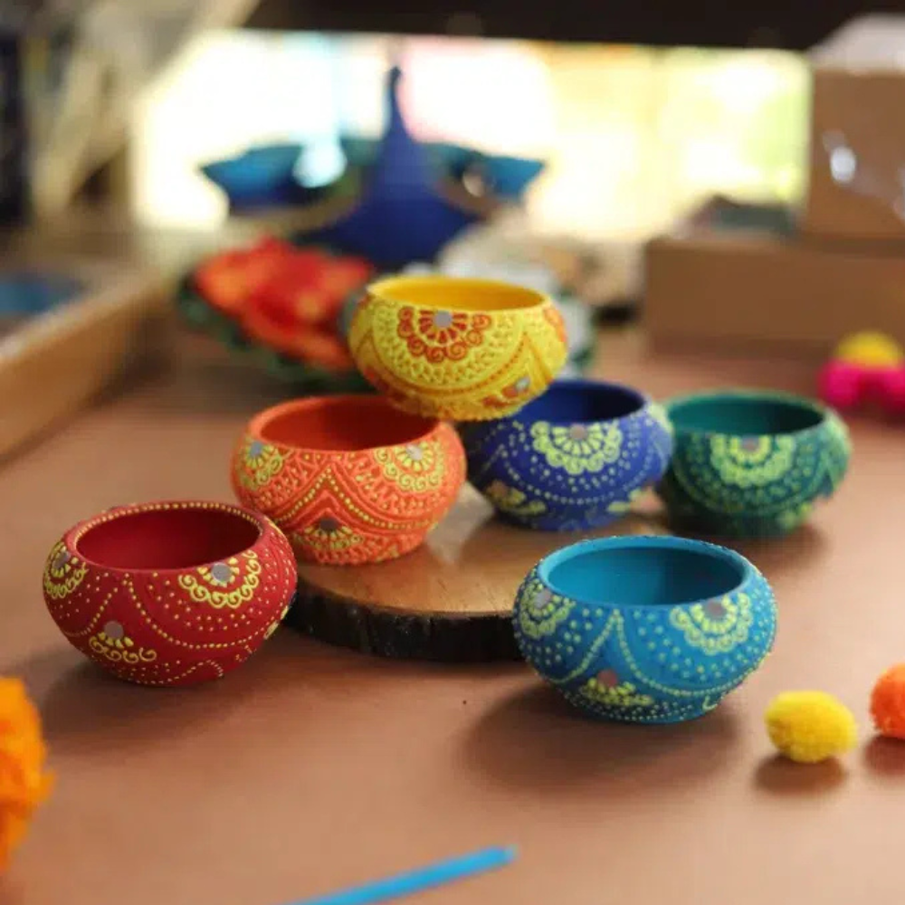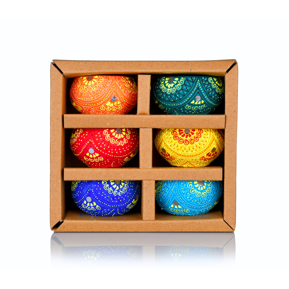 Add timeless charm to your celebrations with the Handmade Terracotta Round Diya, a classic design reimagined in festive colors. Painted in bright shades of yellow, orange, red, blue, green, and turquoise, this diya brings cultural warmth and vibrant energy to your puja space and home décor. Its round bowl shape ensures a steady flame, perfect for rituals and decoration.