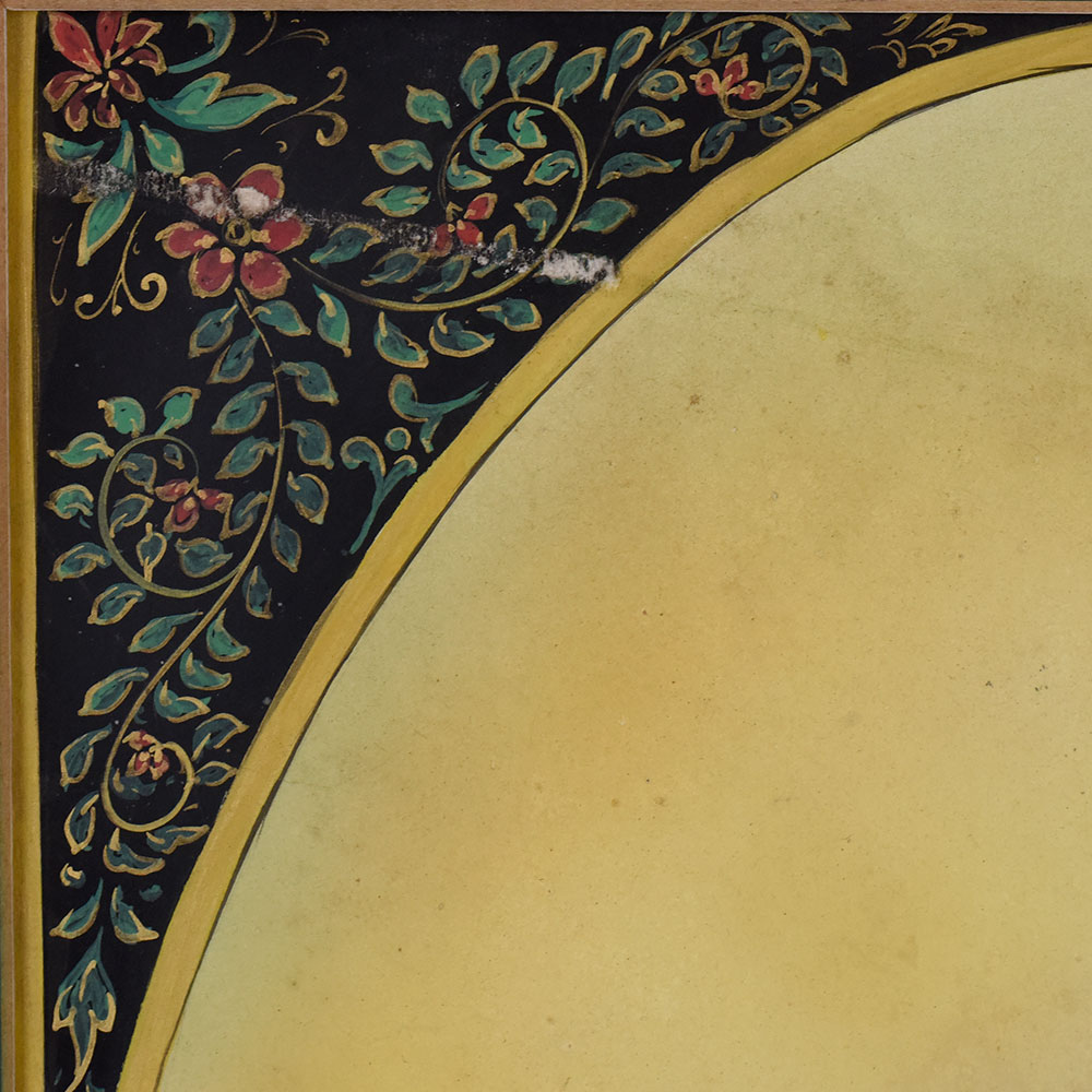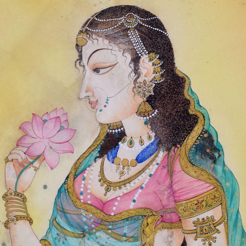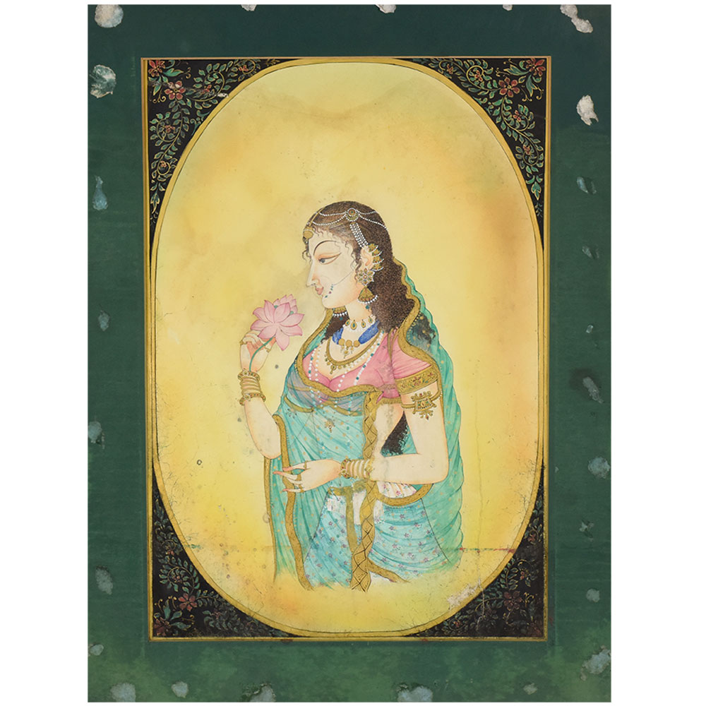 Embrace the charm of classical Indian art with this watercolor paper painting of an elegant lady holding a lotus flower. The artwork beautifully captures the grace and poise of a traditional Indian woman, adorned with jewelry, flowing attire, and delicate features that reflect timeless beauty. Painted in soft shades of green, pink, and gold, the composition highlights the lady in profile, gently holding a lotus that symbolizes purity and spiritual awakening. The ornate floral border and warm yellow background enhance the richness of this miniature-inspired style, making it a striking collectible. Perfect for living rooms, study spaces, or art corners, this painting adds cultural depth and sophistication to interiors. A wonderful choice for art lovers, collectors, and those who appreciate traditional Indian heritage, it also makes a meaningful gift for festivals and special occasions.